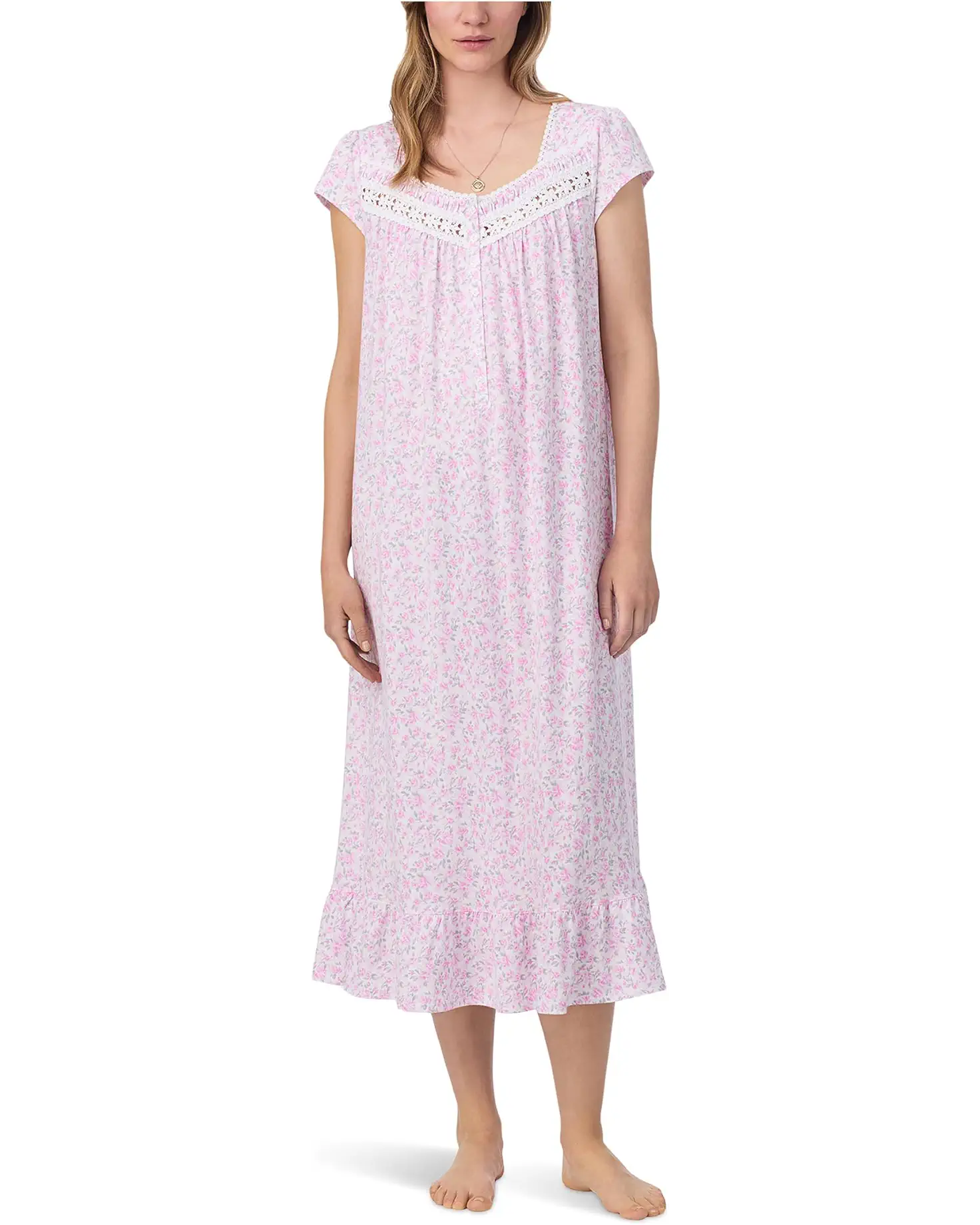 • The Eileen West™ Cotton Knit Cap Sleeve Long Nightgown is perfect for a restful summer night. Made from soft, breathable cotton jersey knit, it offers gentle comfort and feminine charm. Delicate edge ruffles trace the sweetheart neckline, while lace netting embroidery accented with satin ribbon adds timeless detail. Finished with floral akoya shell buttons and a softly ruffled hem, this gown brings grace and ease to your evening routine.