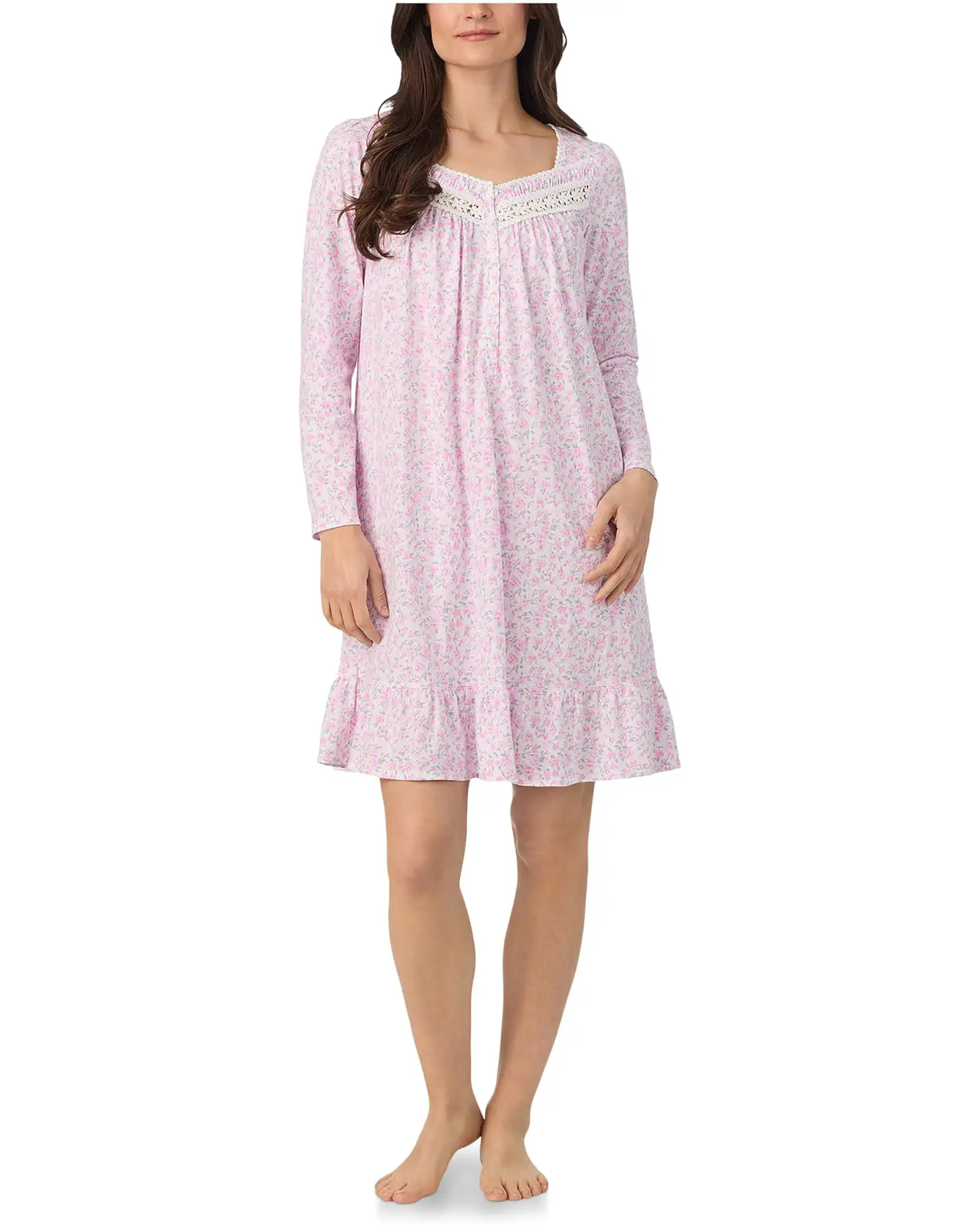 • Get a good night sleep wearing the comfy and chic Eileen West™ Cotton Knit Long Sleeve Short Nightgown. This long sleeve short nightgown is crafted in the most comfortable cotton jersey knit fabric. This nightgown features a classic sweetheart neckline adorned with edge lace. It has inserted venise floral lace and intricate pintucking details at the yoke. Plus, it is finished with flower-shaped buttons, an allover eye-catching print, and a ruffled hem.