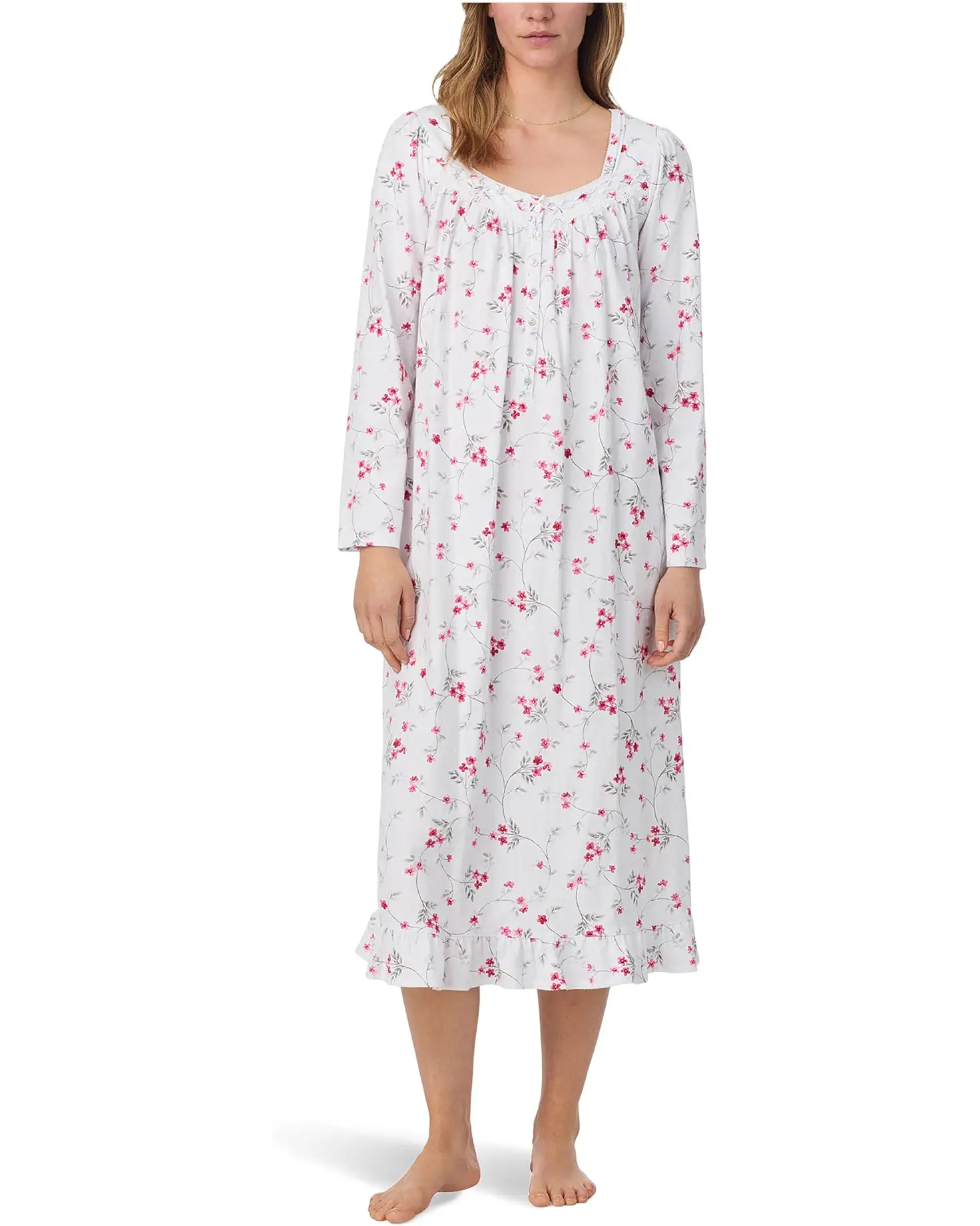 - The Eileen West™ Cotton Peached Jersey 48" Long Long Sleeve Nightgown is designed with a sweetheart neckline adorned in delicate floral lace. Pinched pleats and a satin center bow add romantic detail, while the buttoned front placket is finished with floral Akoya shell buttons for a refined touch. Long sleeves and a softly ruffled hem enhance its graceful silhouette.