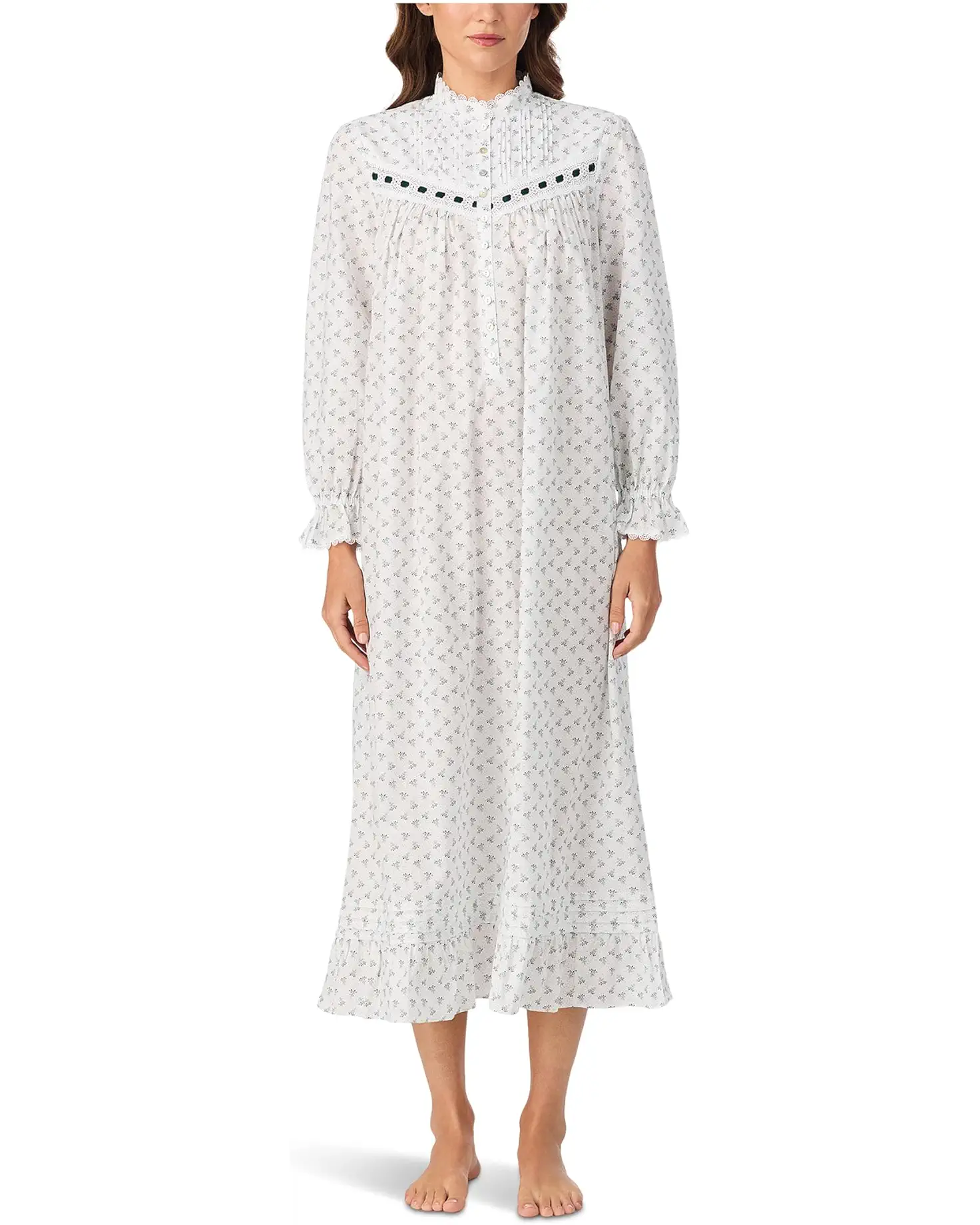 - Romantic elegance meets timeless comfort in the Eileen West™ Cotton Woven Lawn 50" Highneck Nightgown. Crafted in breathable cotton lawn, this ankle-length gown wraps you in lightweight softness, while long sleeves provide gentle coverage for cooler evenings. A mock neck trimmed with delicate edge lace exudes sophistication, complemented by a yoke adorned with glistening beaded Venetian floral lace and a velvet ribbon bow for heirloom charm. Pintucks and shirring add graceful texture, while a button front closure with shimmering Akoya shell buttons offers both beauty and ease. The softly ruffled hem enhances its vintage-inspired romance, making this gown as enchanting to wear as it is to behold.