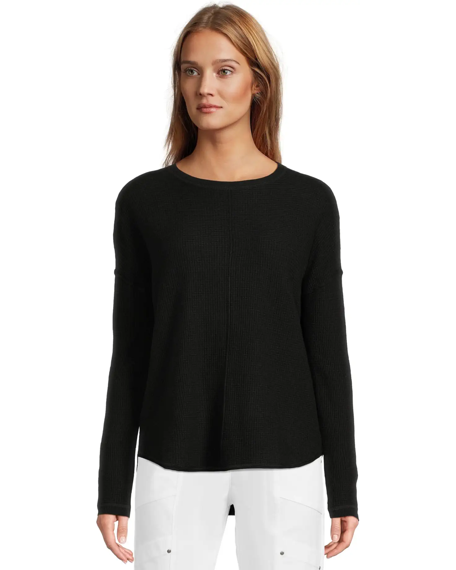 - Find the perfect layer of cozy warmth in the Elliott Lauren™ Cotton Cashmere - Round Neck Waffle Stitch Drop Shoulder Long Sleeve Sweater. Featuring a round neckline with long sleeves, dropped shoulders, raised seams, and a curved hemline.