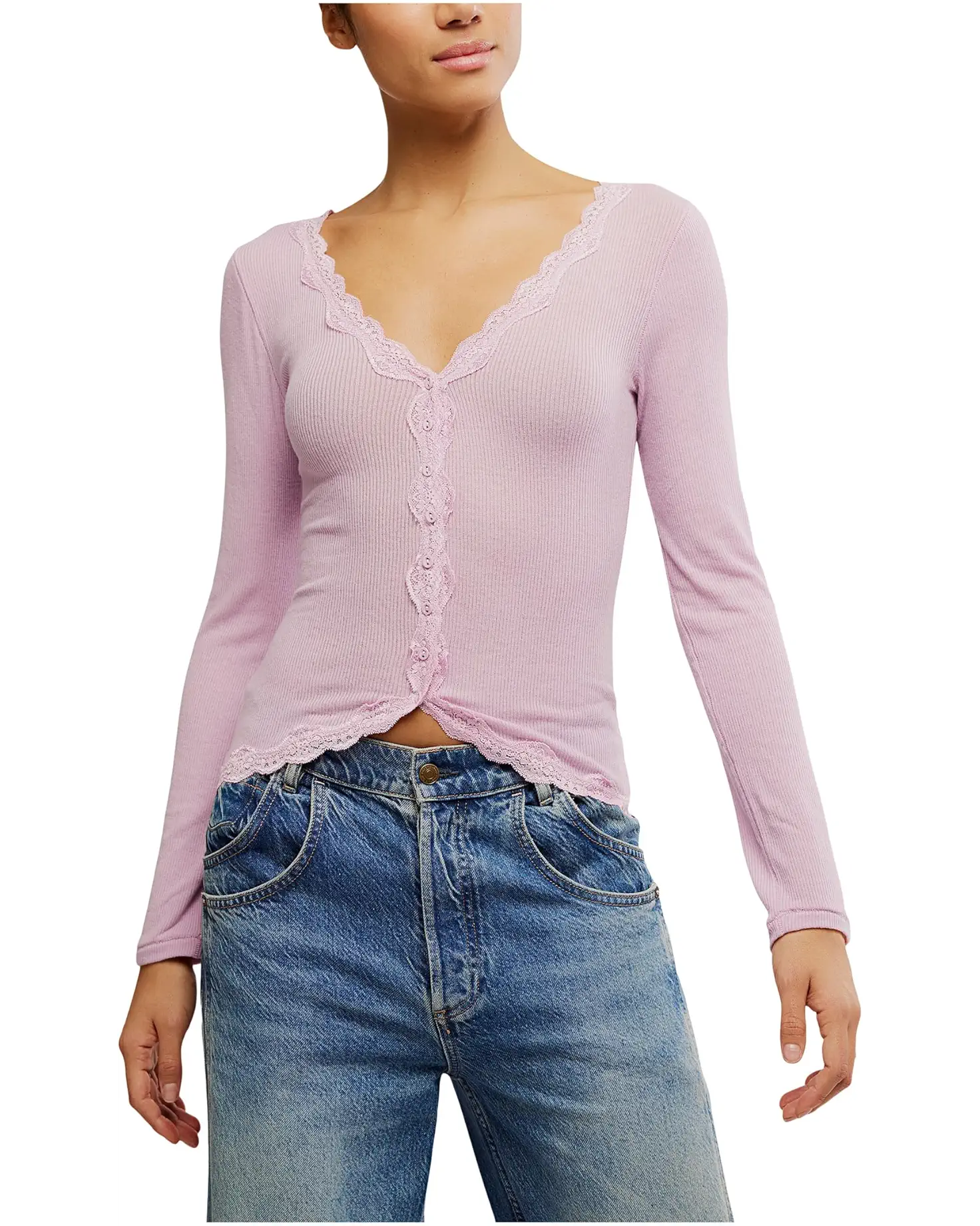 • The Free People™ Big Love Rib Cardi is a cozy, semi-cropped cardigan designed to elevate your layering game. Crafted from a soft ribbed knit, it features a form-fitting silhouette, delicate lace trim, and button-front closure. The rounded hem and V-neckline add flattering structure.
