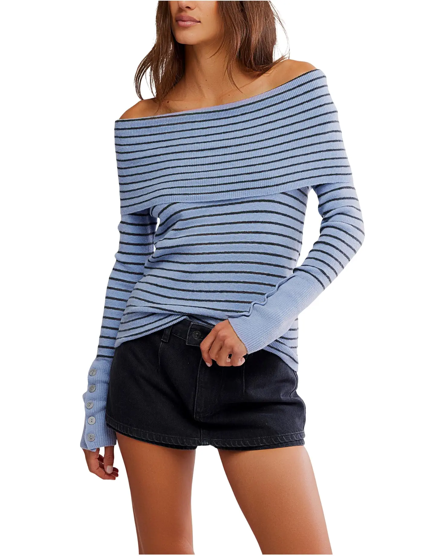 • Free People™ Evergreen Sweater: This cozy off-the-shoulder sweater is the perfect addition to your everyday wardrobe. The classic fold-over neckline and long fitted sleeves create a stylish look that can be dressed up or down. With buttoned cuffs and a trendy striped pattern, the soft, stretchy wool blend sweater is sure to become a staple in your closet.