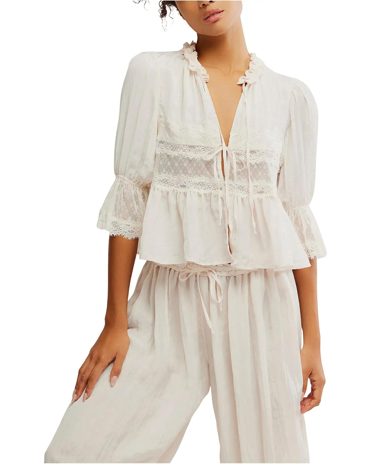 - The Free People™ Forever Young Bed Jacket is effortlessly feminine, blending dreamy details with laid-back ease. Crafted from a soft, breathable fabrication, this pull-on piece drapes in a slim yet relaxed silhouette that flatters from every angle. Sheer lace trim adds an air of vintage romance, while the deep V-neckline and button-front closure give it a flirtatious finish. Slightly puffy quarter sleeves with elasticated cuffs and flared hems elevate the look with just the right amount of drama. The ruffled trim at the neck adds a whimsical charm that feels straight out of a fairytale.