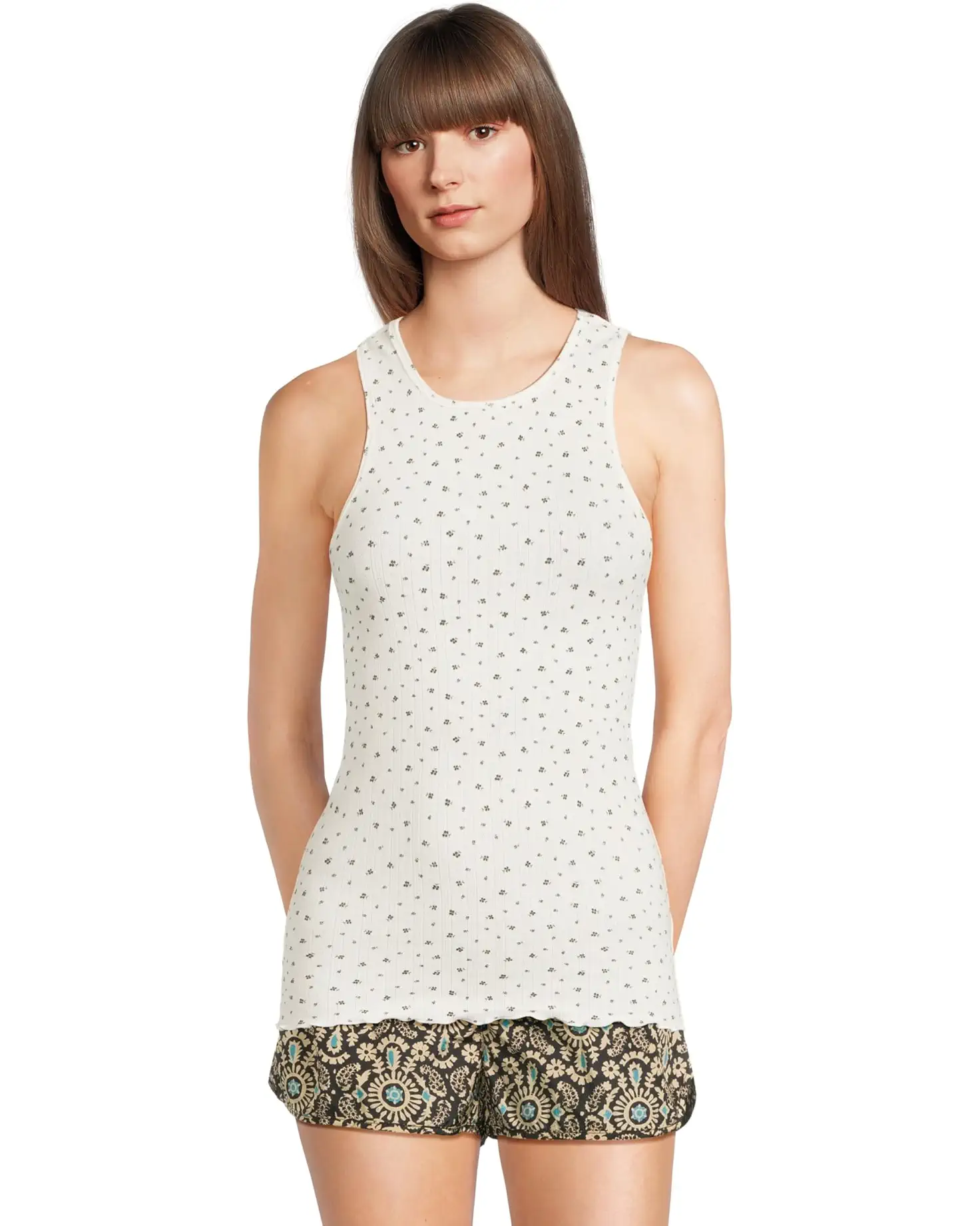 • Rejoice in the soft ribbed fabrication and form fitting silhouette of the Free People™ Fresh In Love Printed Tank Top. The pull-on style top features a crew neck, a sleeveless design, and an allover subtle print. Soft pointelle gives a femme touch to this printed tank, while the lettuce edge trim completes the look.