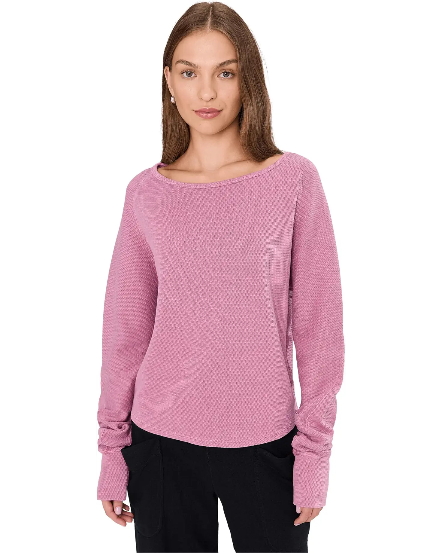 - A cozy base for endless outfitting, this Free People™ Jess Long Sleeve pullover is featured in thermal fabrication with a flattering boat neckline and slouchy dolman sleeves. It has thermal-knit textured cotton-blend construction with a seamed details and elongated sleeve cuffs.