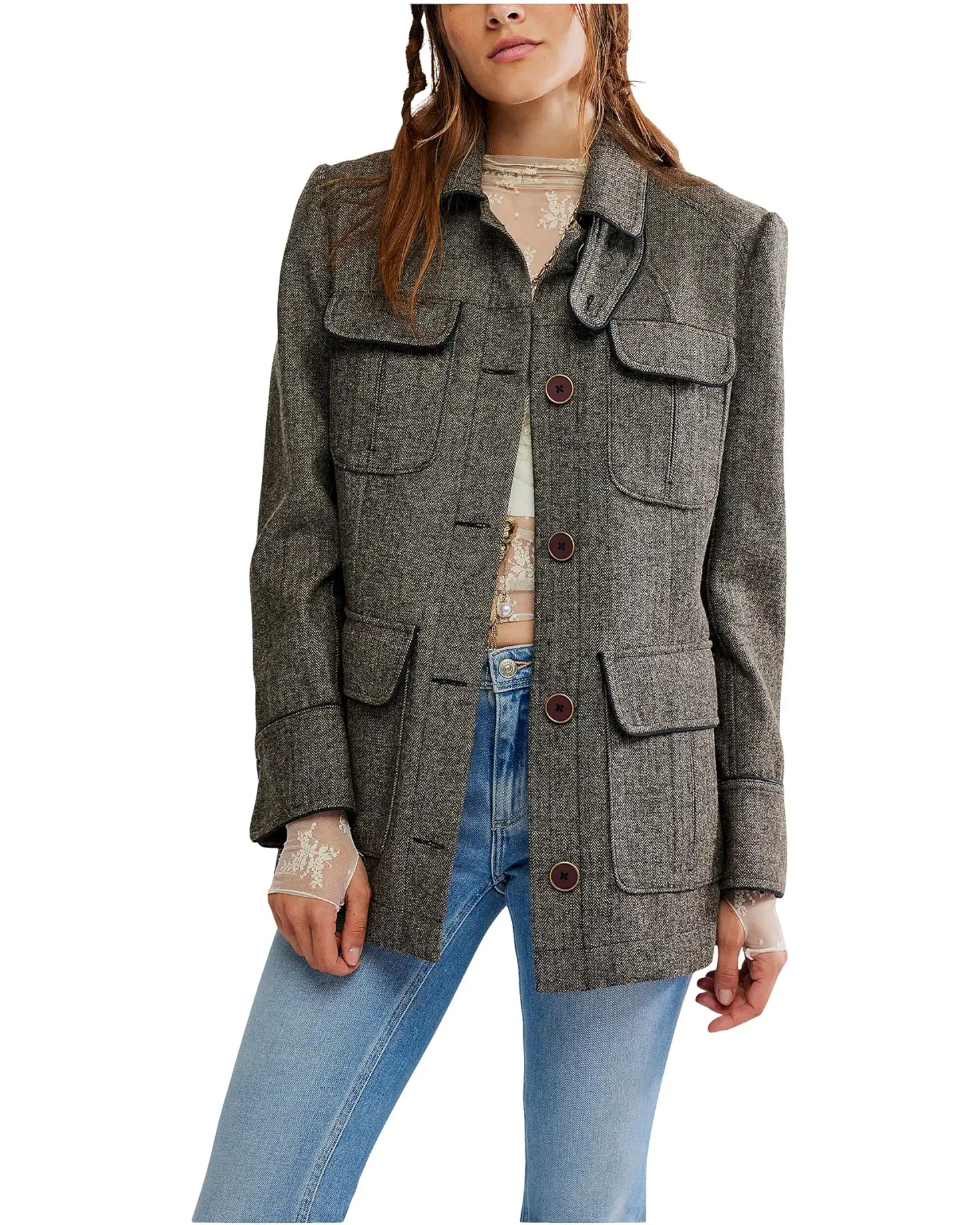 • A classic, tailored layer, the Free People™ Renaux Officer Jacket features classic utility design and timeless herringbone fabrication for endless sophisticated styling. This sleek jacket is designed with long sleeves, buttoned cuffs, a collared neckline, and a straight hem. The buttoned front closure offers easy wear, while the cinching back strap ensures a flattering fit. This button-down jacket works for different occasions.
