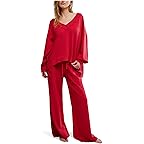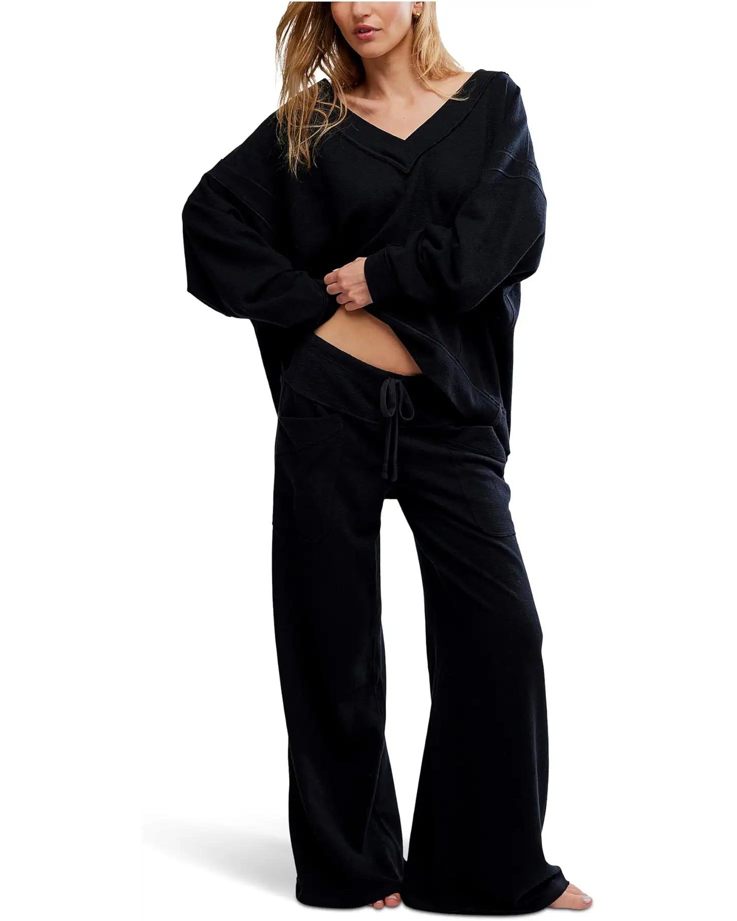 • The Free People™ Staycation Pullover Set comes in a breathable construction and solid color. The pull-on style sweatshirt features a V-neckline, long sleeves, and an oversized fit. The pajamas feature an elasticated waist with a drawstring closure and a full-length silhouette.