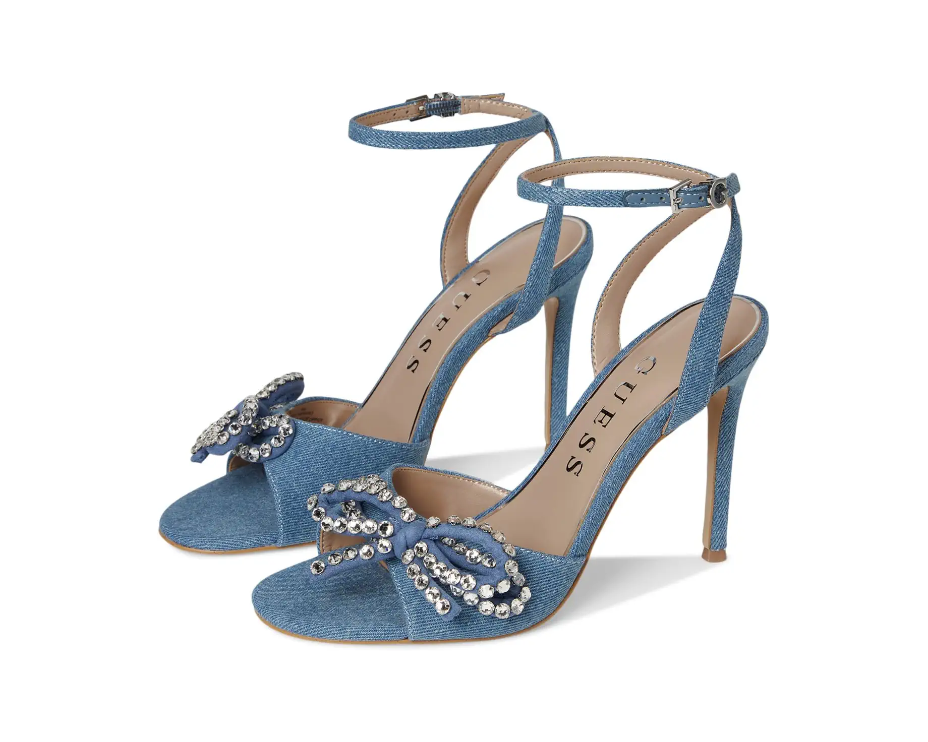 • Make your statement wearing GUESS® Charmin. These show-stopping dress sandals feature a denim upper adorned with dazzling rhinestones and a playful tubular bow, perfect for turning heads at every occasion. The open-toe silhouette and stiletto heel exude elegance, while the adjustable buckle ankle strap ensures a secure, customized fit. Inside, a cushioned insole delivers all-day comfort, and the flexible synthetic rubber outsole moves with every step, letting you dance, strut, and celebrate in style. A modern twist on timeless glamor, Charmin blends youthful energy with sophisticated flair, reflecting GUESS's legacy as a global lifestyle brand since 1981.