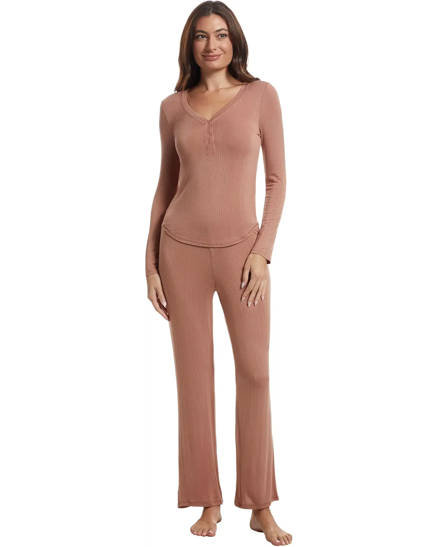 - The Honeydew Intimates™ Dreamland Long Henley Set offers the perfect blend of luxury and comfort. A long sleeve V-neck Henley with snap closures is paired with a wide leg pant in a lightweight drop needle knit. The pull-on style top features a curved hem and the pull-on style pants feature an elastic waistband with snap-button closure and a full-length silhouette.