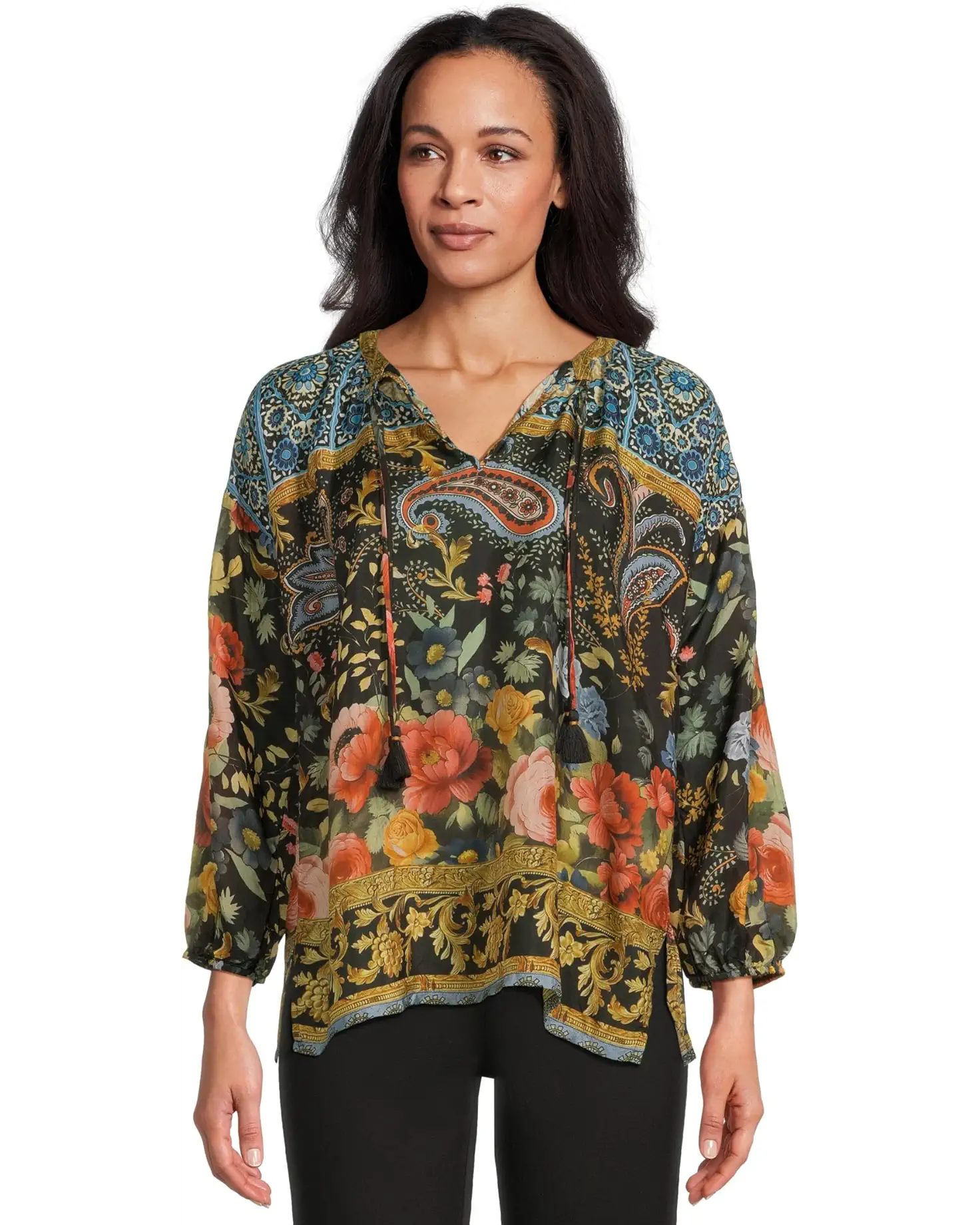 - Boho-chic vibes meet effortless elegance in the Johnny Was® Margot Blouse. Designed to make a statement, this Margot Blouse is embellished with a bold, ornate pattern that turns everyday dressing into an art form. Featuring a split V-neckline with a drawcord tie, it offers versatile styling; wear it tied for a polished look or left open for a laid-back, breezy feel. Drop shoulders and bishop sleeves add a touch of romantic drama, while the relaxed-fit bodice creates an airy silhouette perfect for layering or wearing solo. With its easy pull-on design and lightweight flow, this blouse blends comfort with sophistication, making it the ultimate piece for dressing up your casual days or adding flair to your evenings.