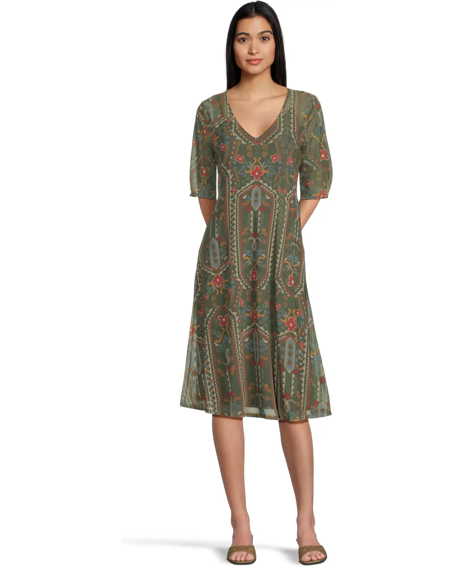 - You are going to love your pretty and casual look wearing the Johnny Was® Sayler Mesh Midi Dress Skylar Bloom. The dress features a V-neckline, a back zippered closure, half-sleeves, allover eye-catching pattern, and a flowing A-line skirt that is intended to hit slightly below the knees. Pair with strappy heels or pumps and you are good to go.