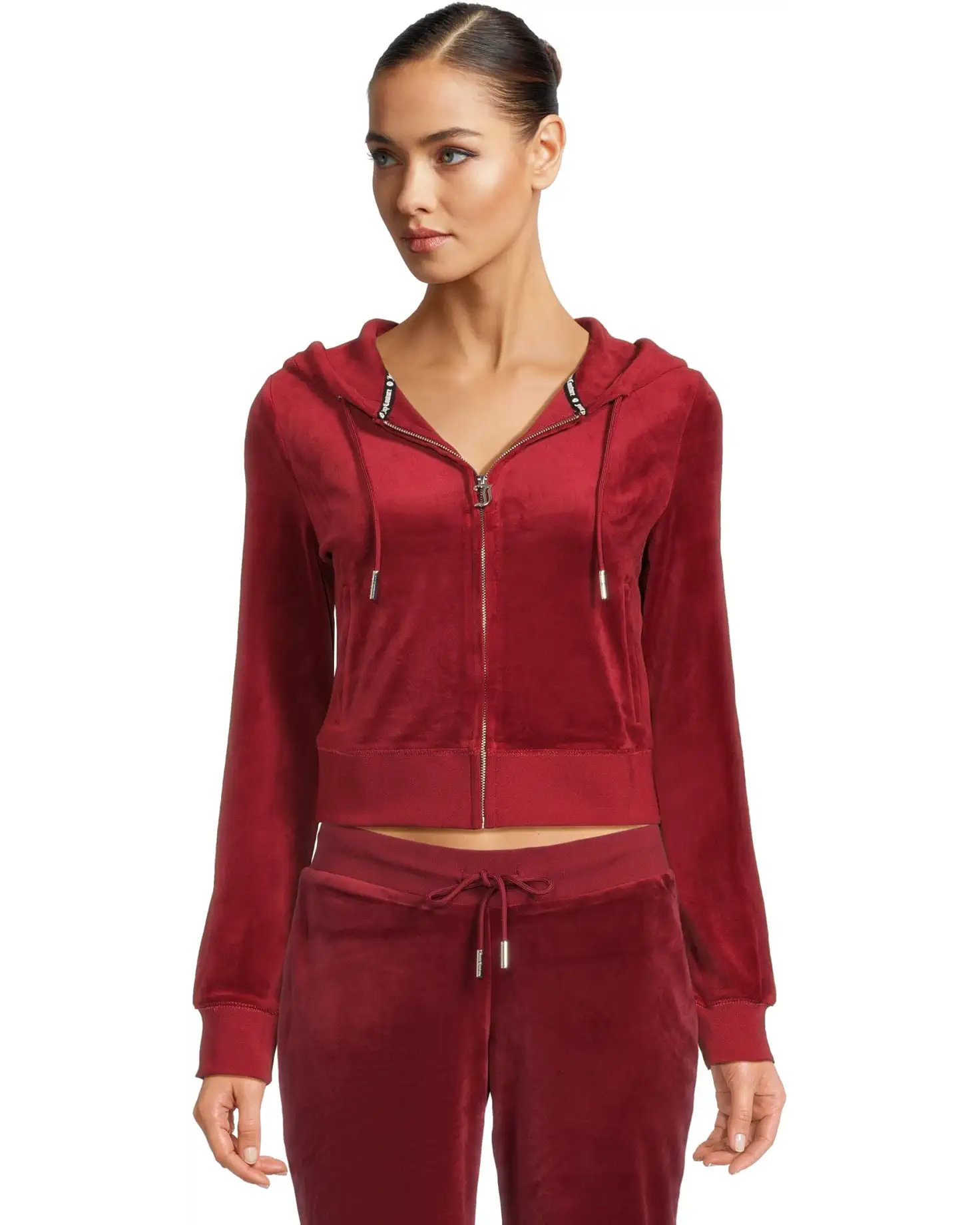 • Express your inner fashionista this fall by pairing up your laid-back style or post-workout outfit with the Juicy Couture® Solid Classic Juicy Hoodie With Back Bling. Designed in a super-soft, cozy, and luxe velour fabric, this layering essential features a hooded construction with adjustable drawstring, long sleeves with ribbed cuffs, full-length zippered front with an iconic gothic logo zipper pull, functional hand pockets, and a ribbed hem. All style of this hoodie lies in its shimmery logo embellishment at the back.