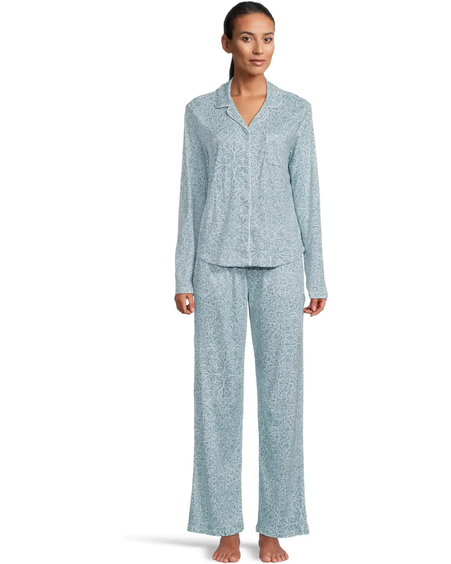 - The Karen Neuburger® Novelty Print Long Sleeve Girlfriend Pajama Set features a button-front long sleeve top with a notched collar and coordinated piping, paired with relaxed-fit pants that include a drawstring adjustable elastic waistband for easy comfort. The lightweight knit fabric is adorned with subtle prints, adding a playful touch to its luxurious feel.