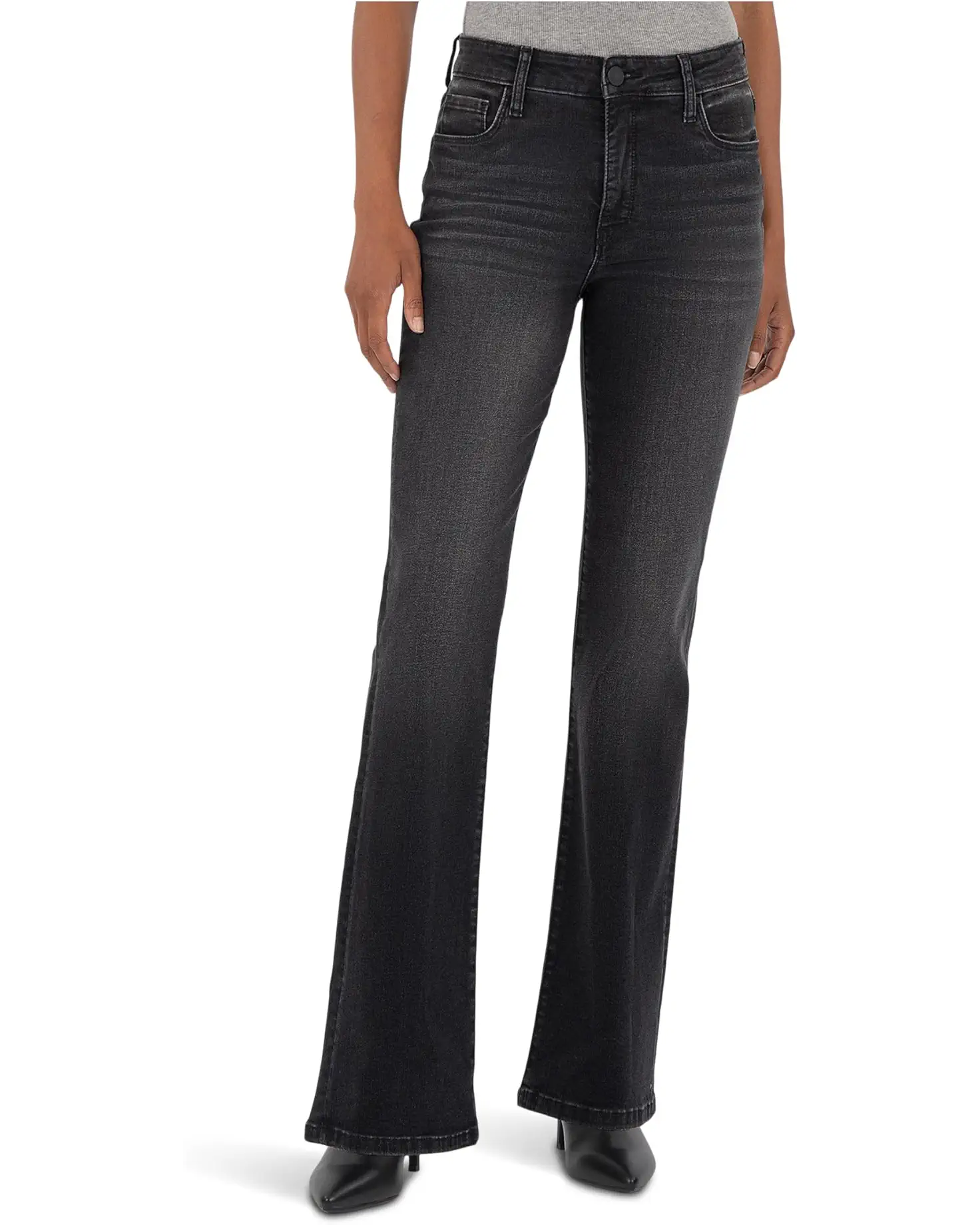 - The KUT from the Kloth™ Ana High-Rise Fab Ab Flare-Baby Dn All Over is reminiscent of a popular 70s fashion style. It is a high-rise and has a slim fit through the legs. It kicks just below the knee to create the perfect flared silhouette. Fits great on a taller figure. Pair with a cute pair of sneakers for an on-trend look or dress up for a night out!