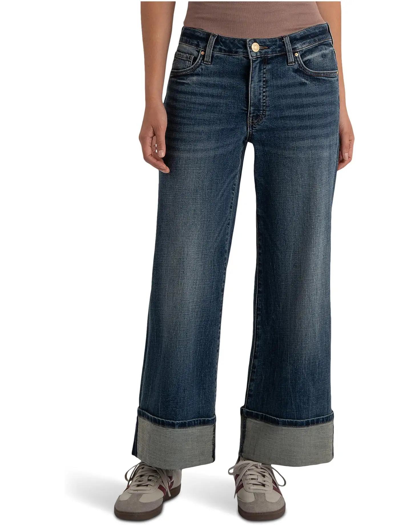 - Laid-back with the perfect amount of style, wide-leg fitted through the hips. The KUT from the Kloth™ Meg High-rise Fab Ab Wide Legs Roll Up Regular Hem In Interconnected is fitted through the hips and thighs and finishes off with an easy-to-style wide-leg for a modern take on this trending silhouette. The stretchable jeans feature a high-rise waist with belt loops, a zip-fly, and a button closure.