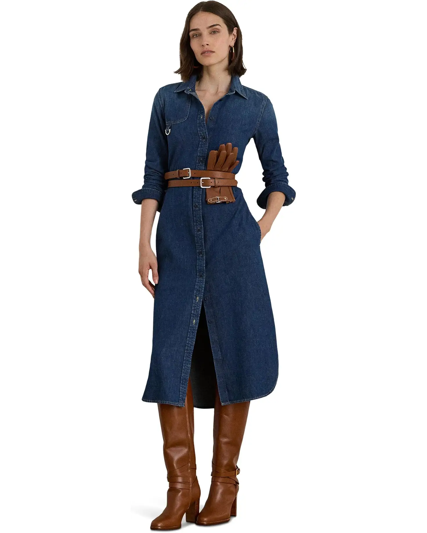- Balancing the casual appeal of denim with a sophisticated shirtdress silhouette, the Lauren Ralph Lauren® Horsebit-Trim Belted Denim Shirtdress is a versatile piece that can be dressed up or down. A horsebit charm at the chest provides a subtle, equestrian-inspired finish, while the buttoned front placket features custom-developed buttons with a "Lauren Ralph Lauren" logo. It is styled with long sleeves, buttoned barrel cuffs, a point collar, and a shirttail hem. This denim dress comes with a removable self-belt for a perfect fit.