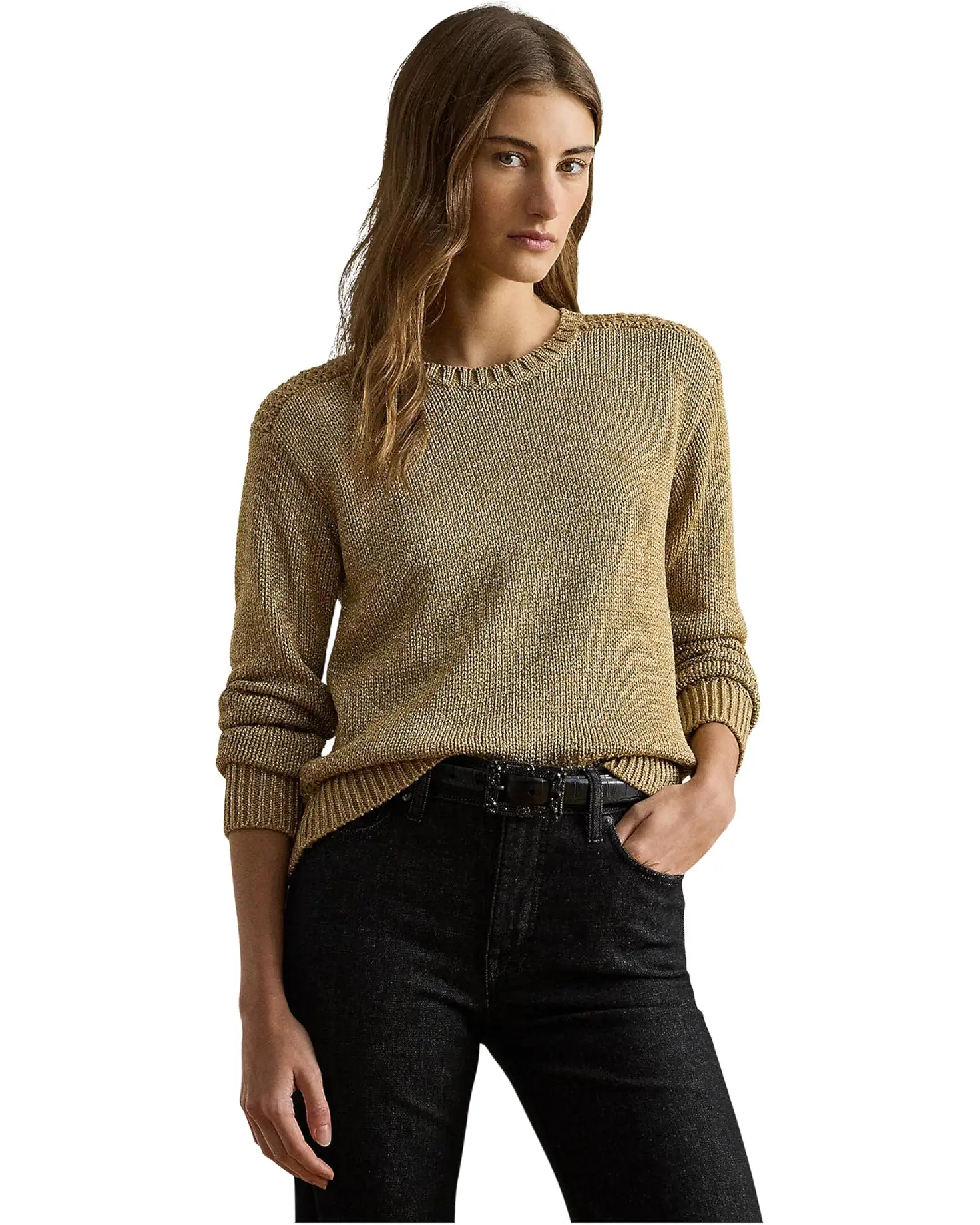 • Rendered in a metallic cotton blend, this modern crewneck sweater is finished with rack stitching at the shoulders, cuffs, and above the hem. Featuring a ribbed crew neckline, dropped shoulders, long sleeves with ribbed cuffs, rack stitching at the shoulders, above the cuffs, and above the hem, and a ribbed hem.