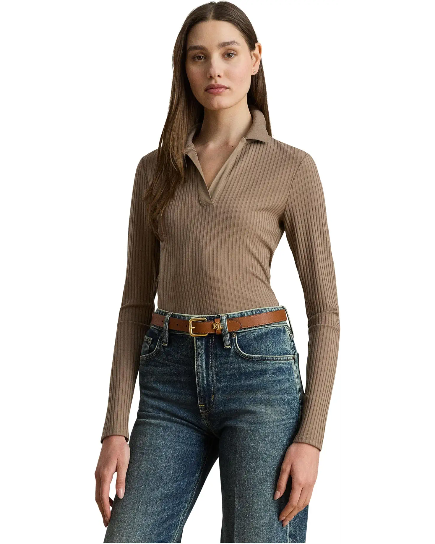 - The Lauren Ralph Lauren® Rib-Knit Long-Sleeve Polo Top elevates your look effortlessly. Quintessentially Ralph Lauren, this version of the iconic Polo features V-neck with Johnny collar, pull-on styling, long sleeves and a dimensional rib-knit construction. A tonal "LRL" logo at the shirttail hem completes the look.