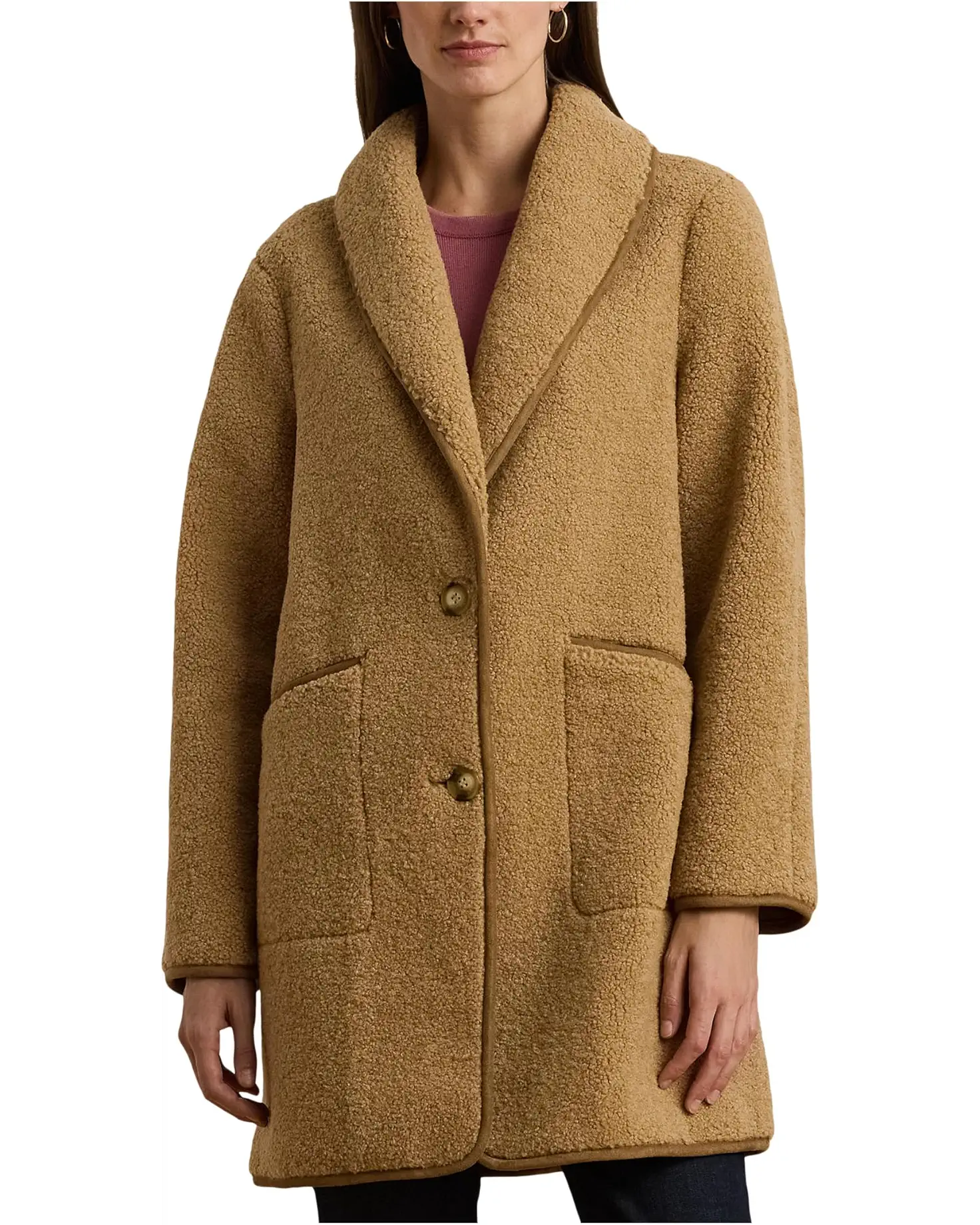 - Embrace luxury in every stitch, warmth in every layer wearing the Lauren Ralph Lauren® Sherpa W Trim 2 Bttn. This polyester lining coat features shawl collar neckline, long sleeves, button front closure, and two front hand pockets.