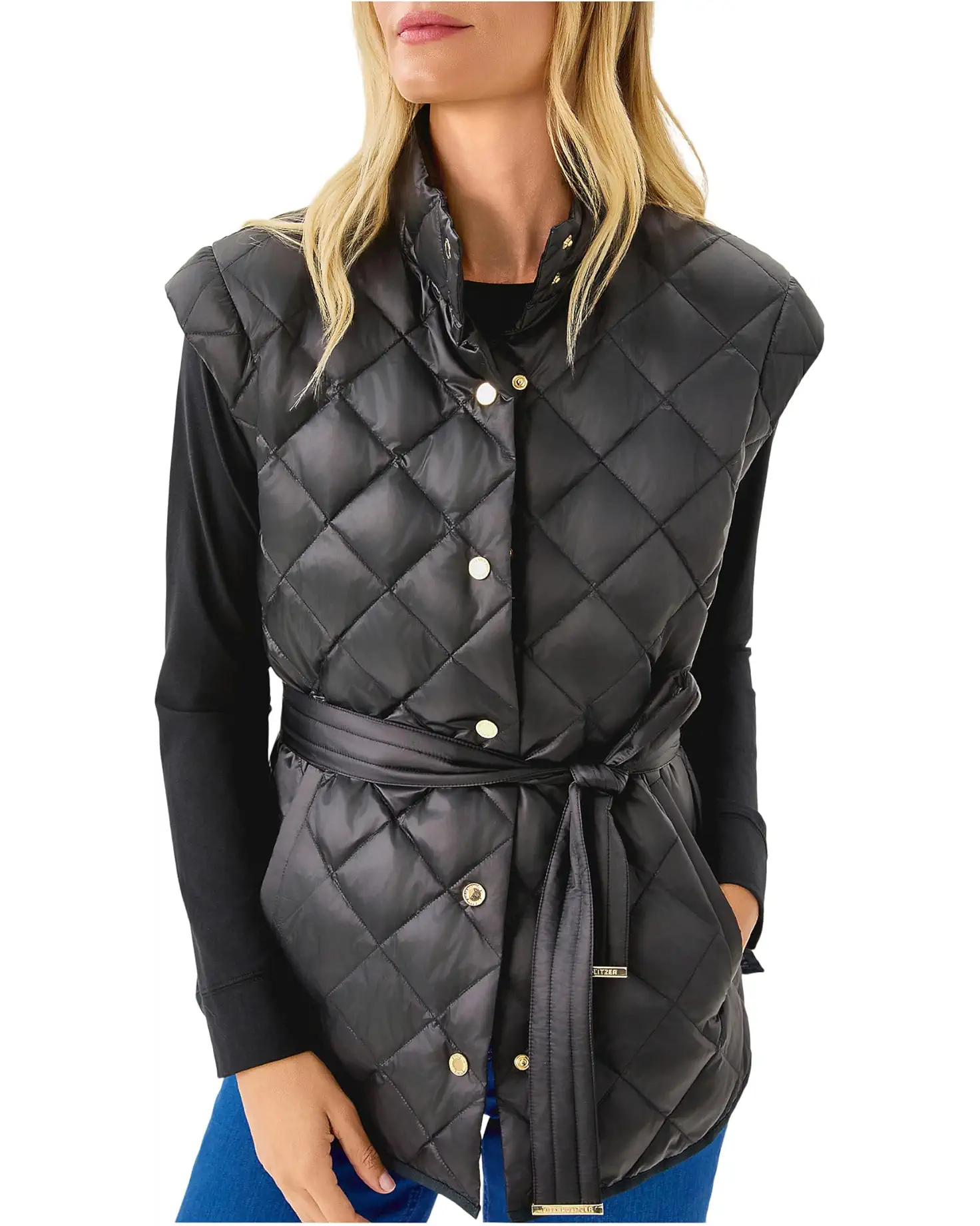 - Brighten your look in the Lilly Pulitzer® Adenna Vest. Designed in a regular fit with a collared neck and sleeveless silhouette, this vest offers freedom of movement without compromising style. The snap button front closure ensures quick, fuss-free dressing, while slant pockets provide convenient storage for your essentials. Its easy-fit design and tie waist allow for a flattering, customizable shape, making it perfect for layering over sweaters, tees, or dresses.