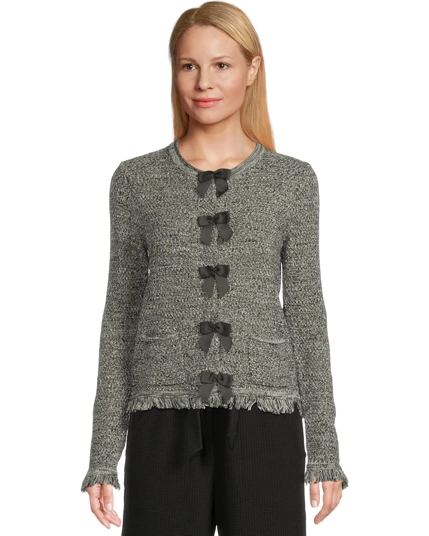 - The Lilly Pulitzer® Kelso Cardigan is a long-sleeve cardigan with a fringe trim and four bows at the front placket. Made from cotton, it is designed with a crew neckline and a straight hem.