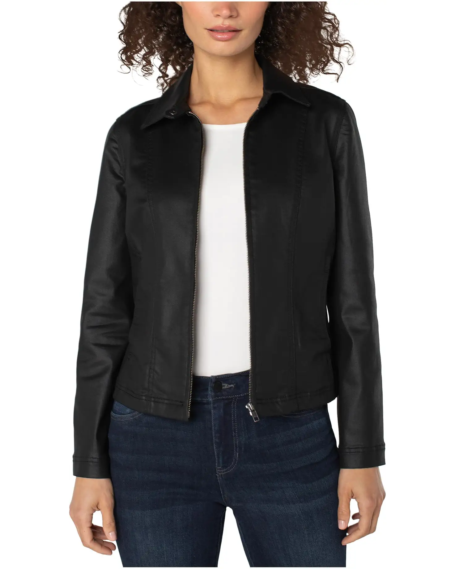 - Step into the spotlight with the Liverpool Los Angeles™ 90's Zip Front Coated Black Denim Jacket, a statement piece that exudes elegance, making it perfect for any festivities on your calendar. The tailored silhouette of this standard-length jacket accentuates your figure while providing a comfortable and versatile fit. It features a mock neckline, long sleeves, a zipper-front closure, and two front pockets for added funtionality. Whether you're mingling at a cocktail party or attending a formal dinner, this piece effortlessly transitions from day to night, offering endless styling possibilities.