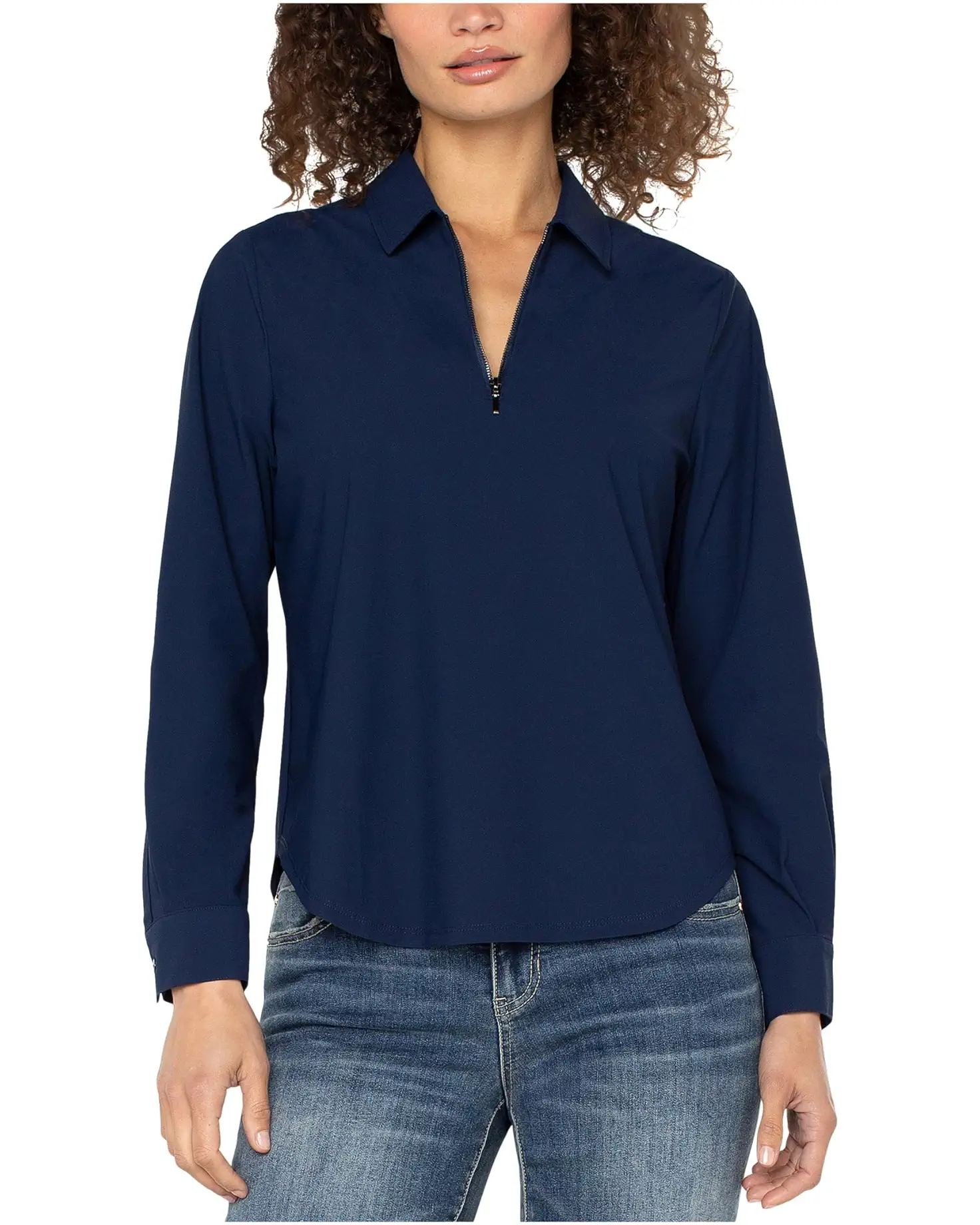 - The Liverpool™ Los Angeles Long Sleeve Collared Zip Front Knit Shirt is a versatile wardrobe essential that effortlessly combines comfort with classic style. Crafted from soft and stretchy knit fabric, this shirt offers a cozy and breathable feel, making it perfect for year-round wear. It has a collared neckline with a quarter-zip placket, long sleeves with buttoned cuffs, and a curved hem.
