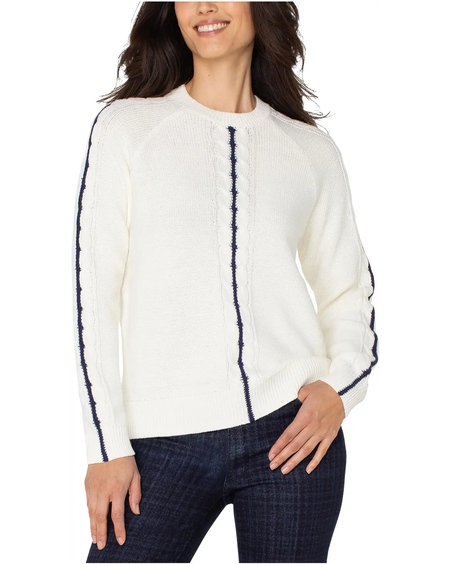 • The Liverpool™ Los Angeles Long Sleeve Crew Neck Raglan Sweater is a timeless wardrobe staple, designed to keep you warm and stylish throughout the seasons. Featuring a classic crew neck and long sleeves, this pull-on sweater combines classic comfort with contemporary flair. The raglan sleeves add a touch of sporty elegance for a relaxed fit, making it perfect for layering or wearing on its own.