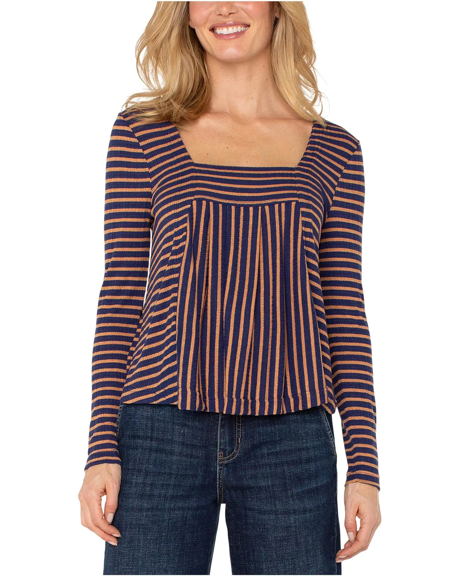 - Elevate your wardrobe with ease and sophistication wearing the Liverpool™ Los Angeles Long Sleeve Square Neck Knit Top. The pull-on style top features a squared neck, long sleeves with barrel cuffs, and pleated details at the front. Designed for both style and comfort, this long sleeve top features a charming ginger and blue stripe print that effortlessly complement any denim outfit.