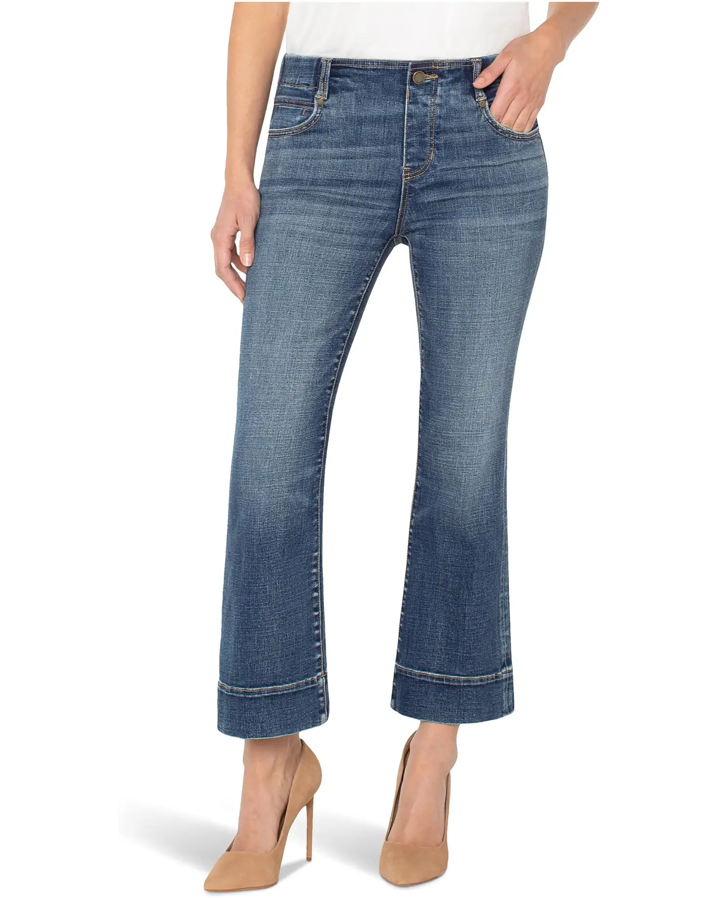 - The brand's signature pull-on jeans, the Liverpool™ Los Angeles Petite Gia Pull-on Mid-rise Flare W/ Wide Hem Jeans, are where innovation meets style. Slip into these flares for a perfect combination of ease and elegance. They are designed in a flared-leg silhouette with a mid-rise waist. These denim jeans are finished with a zip-fly, buttoned closure, and belt loops. Their Crosshatch denim fabrication offers all-day comfort and a better range of movement. With their patented design, these flared jeans offer a smooth, flattering fit that highlights your curves while delivering unbeatable comfort.
