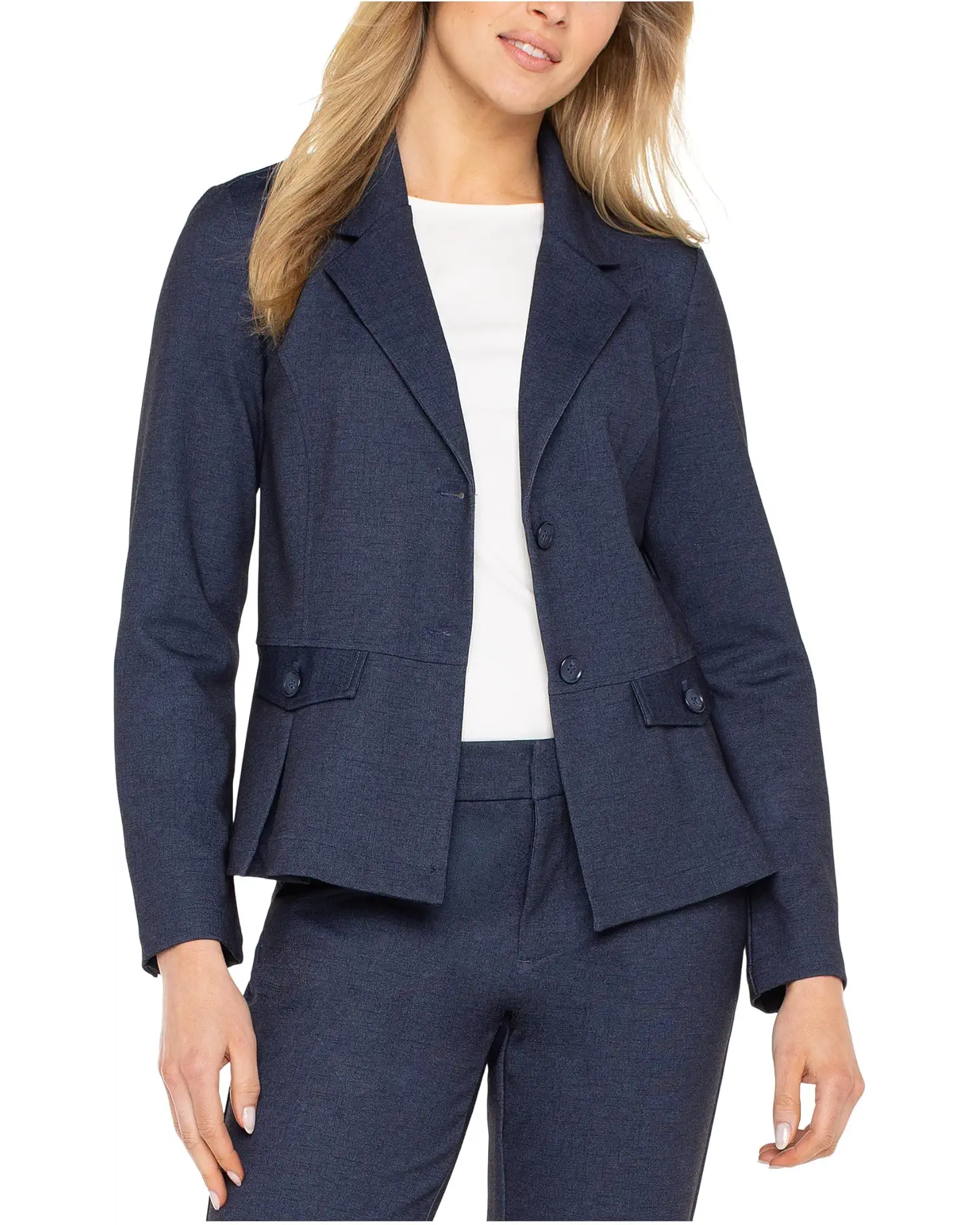 • In a refined navy dusk, this Liverpool™ Los Angeles Printed Serge Knit Peplum Blazer is tailored with a peplum silhouette that creates a flattering, feminine shape. The box-pleated hem adds subtle movement, while the polished design makes it easy to style from desk to dinner. It has a notched lapel collar, long sleeves, and two button-flap pockets on the front. A modern statement piece that elevates any look.