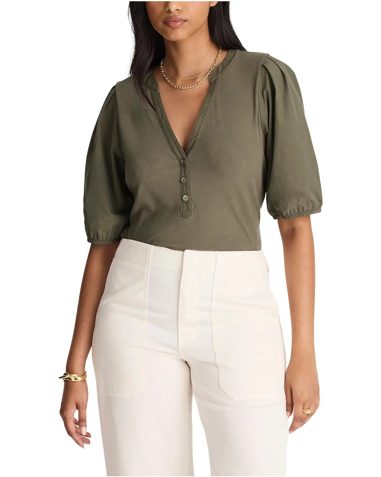 - The Madewell® Mixy V Neck Puff Tee is a great choice whether you're getting ready for work or dressing up for a casual outing. Made from a Lyocell® blend fabric, this stylish top features short puff sleeves, a V-neckline, and a straight hem. The three-button front placket ensures easy wear. This button-down top makes a great addition to your wardrobe.