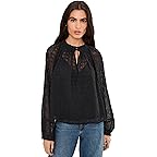 • The Nayla Lace Top from Madewell® is a lightweight, semi-sheer blouse designed with a soft, flowing bohemian vibe. It features a delicate ruffled neckline that can be tied into a bow or left loose for a more relaxed look. The long sleeves have subtle volume with ruffled cuffs.