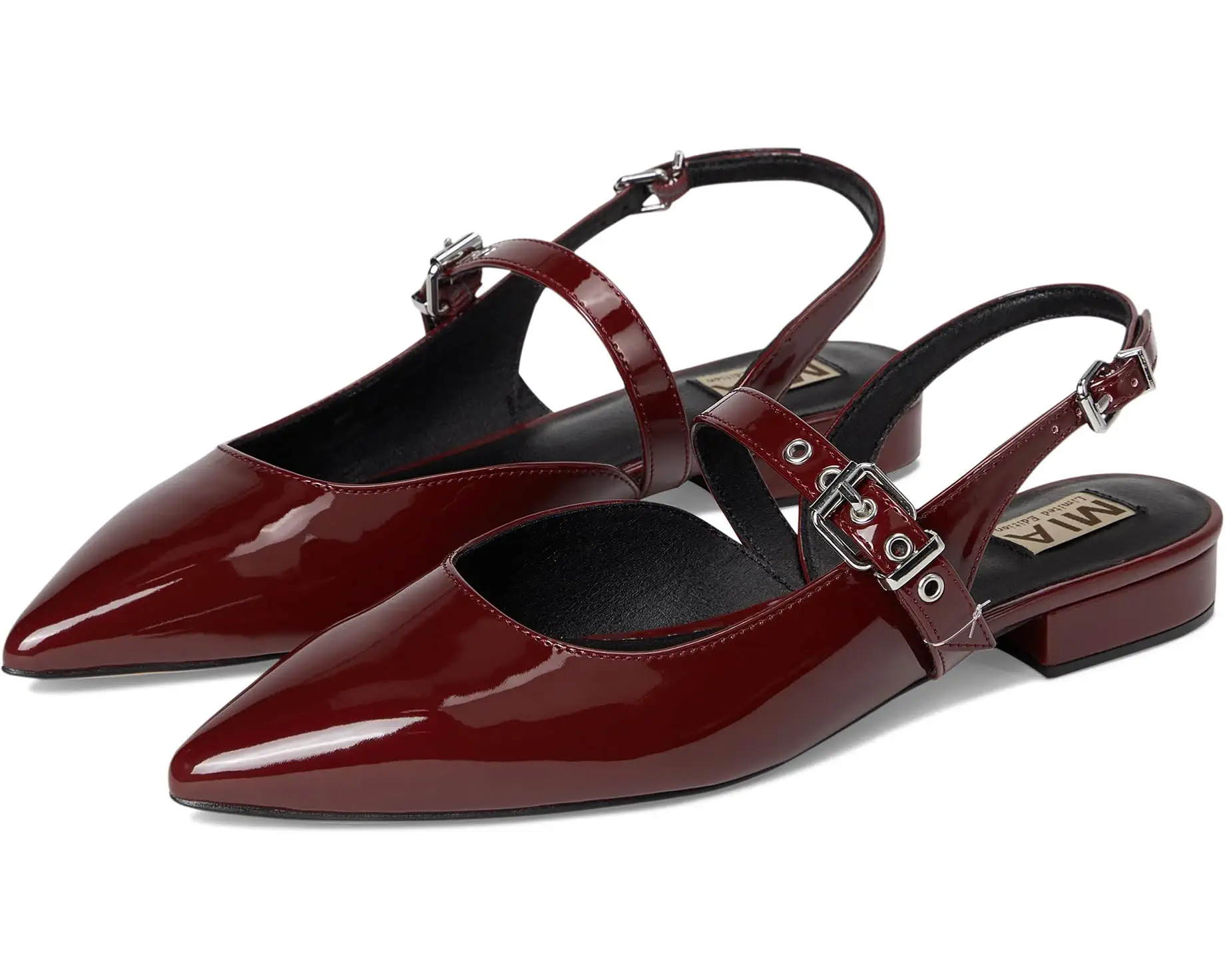 • Stay on trend with this sleek yet sophisticated flat. The MIA™ MLE-Aree is crafted from patent material available in a fun metallic or basic fall hues. The pointy toe adds a refined touch, while the slingback silhouette and delicate adjustable buckle offers a comfortable fit. Perfect for dressing up your work wear or adding polish to an evening look.