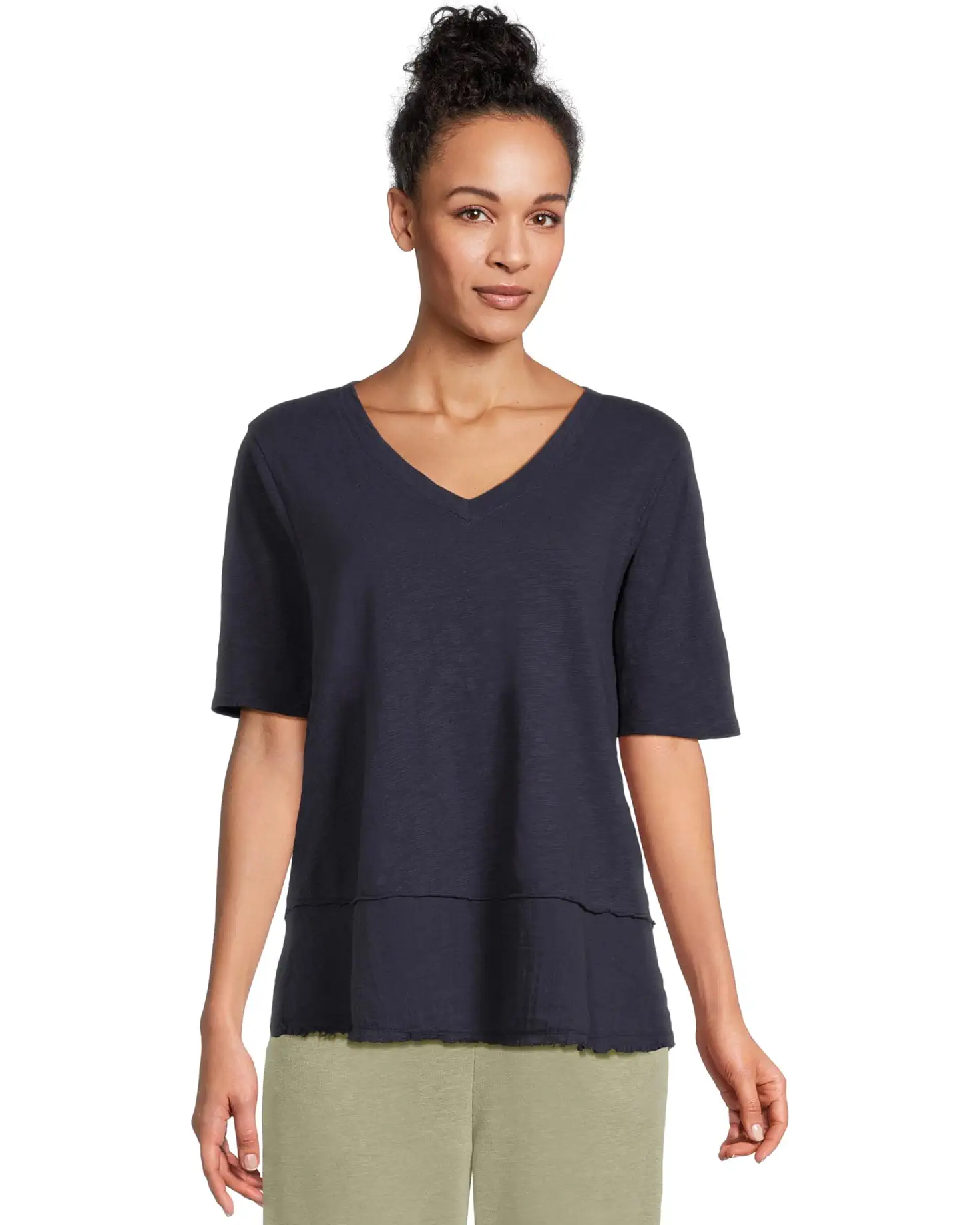 - Add comfort and style to your everyday look wearing the Mod-o-doc™ Half Sleeve V-neck Mix Media Top. The pull-on style top features a V-neckline, short sleeves, and a standard-length silhouette.
