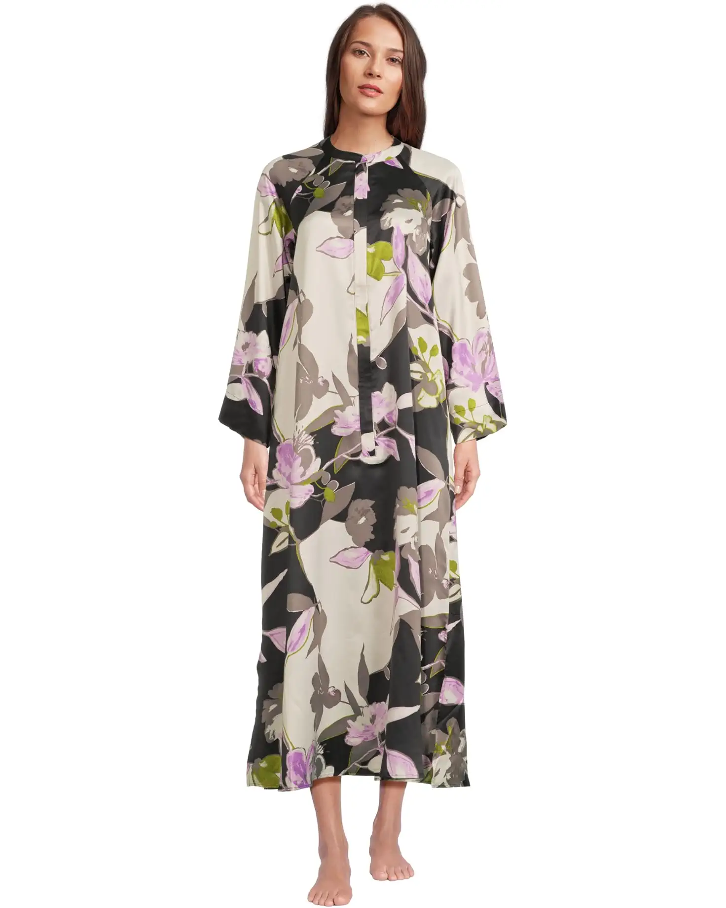 • Step into luxury wearing The Natori™ Tsubaki Mandarin Zip Caftan. Designed with a relaxed fit and a flattering mid-calf length, this piece brings lounge-to-luxury versatility to your wardrobe. The crew neck and long sleeves keep the look classic, while the sleek zippered front closure adds a touch of contemporary edge. Crafted from silky charmeuse with a glossy hand feel, it drapes beautifully on the body and showcases an allover print that's as eye-catching as it is timeless. Wrinkle-resistant fabric makes it a travel-friendly essential, ensuring you look polished wherever the day takes you. The pull-on ease keeps it fuss-free, while the luxe texture elevates every moment.