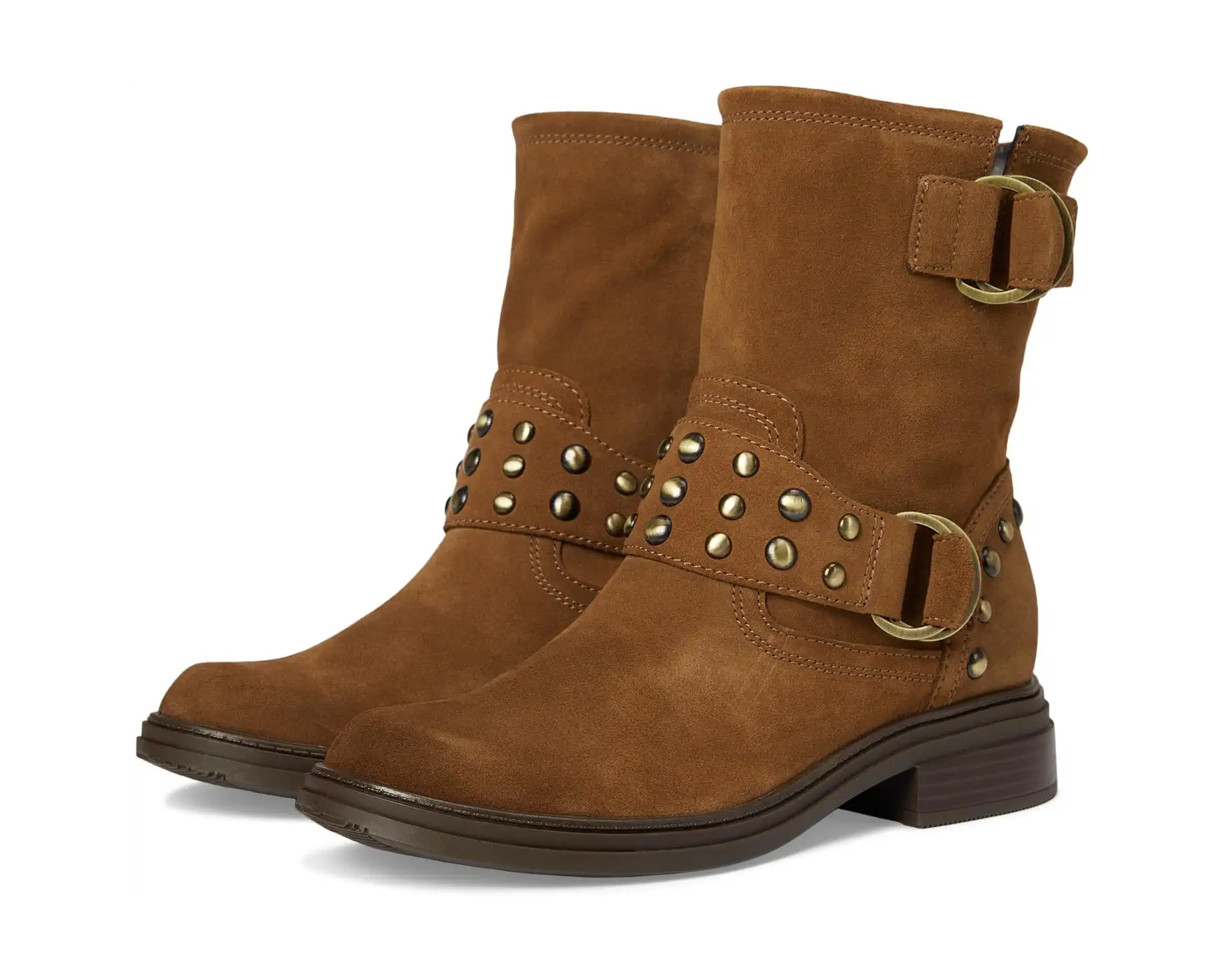 - Elegant edge. The Naturalizer® Optimus moto boot with a studded leather strap delivers sleek street style. This mid-calf boot blends rugged Western charm with modern comfort, featuring bold buckles and classic stitching across a leather upper with a rounded toe. A zippered side closure ensures easy wear, while Contour+ Comfort technology delivers a premium fit with responsive cushioning for all-day support.