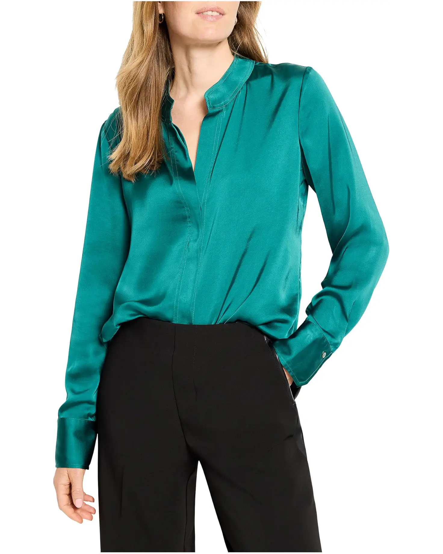 - An easy band collar top taken to the next level with anything-but-ordinary construction. Crafted from a luxe Day Gloss fabric, she offers the sophisticated look of silk with a more durable, easy-care design. With a hidden button front and cuff. The weight of the fabric provides a flattering drape, while the breezy woven construction ensures all-day comfort.