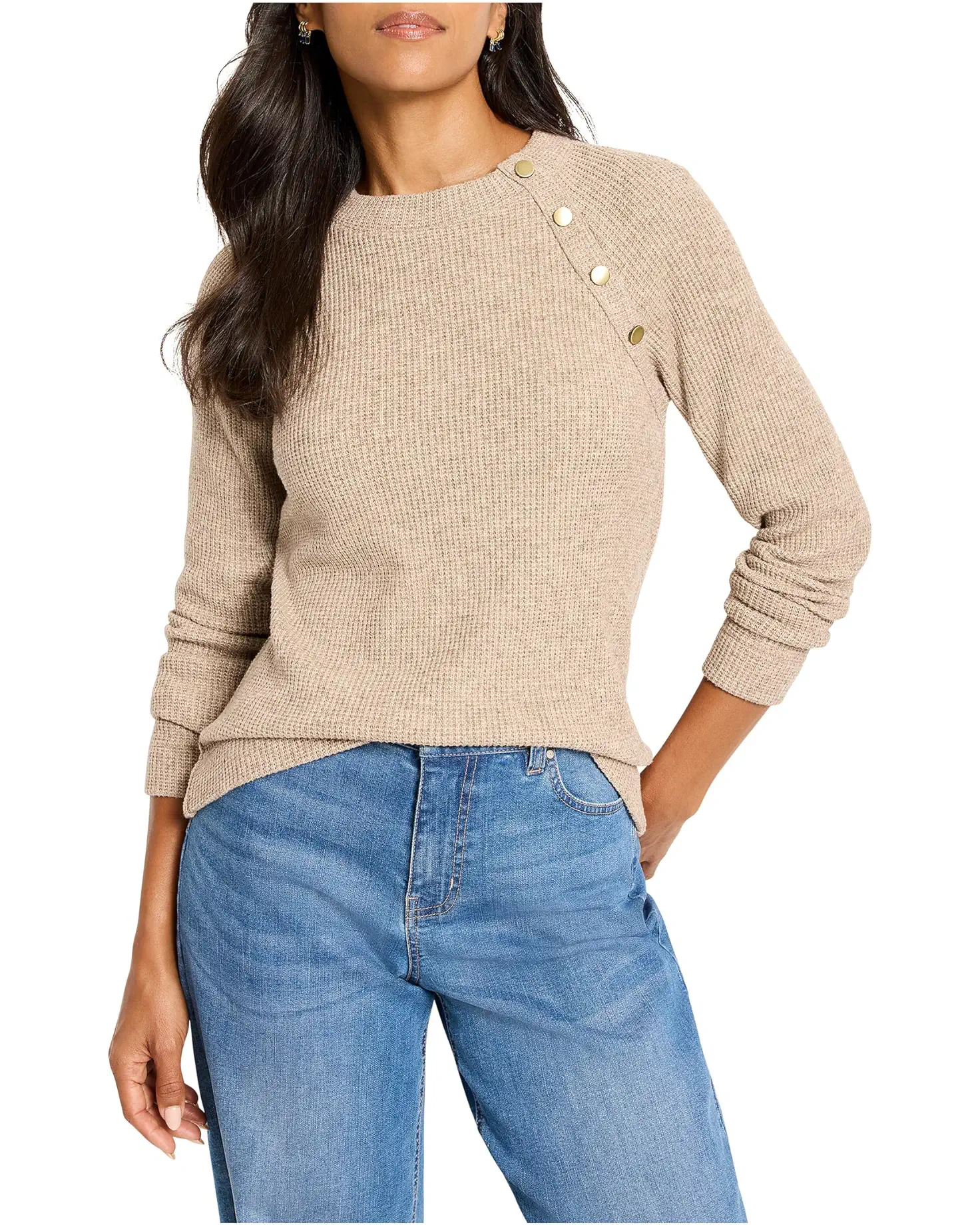• The ease of a tee with the textured look of a sweater, this chic NIC+ZOE™ Petite Soft Thermal Button Top is the best of both worlds, perfect for dressing up or down. The round neckline with button detailing at the shoulder lifts the look while the thermal waffle knit construction keeps things cozy. The pullover-style midweight textured sweater comes with raglan sleeves to create extra shape and a straight hem that compltes the look.