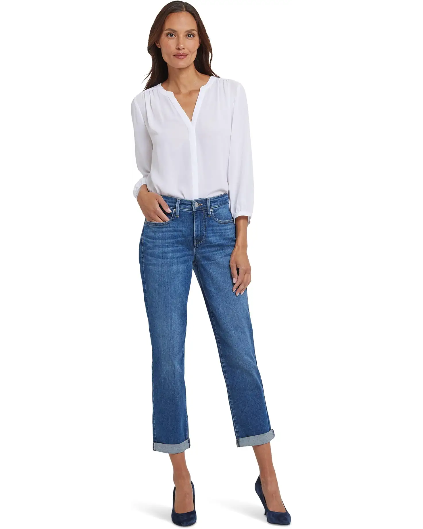 - The just-slouchy-enough cut of NYDJ® Margot in Opera Blue is slimmer (and more slimming) than a boyfriend jean while maintaining a laid-back looseness through the leg. Features a classic five-pocket styling and adjustable rolled cuffs.