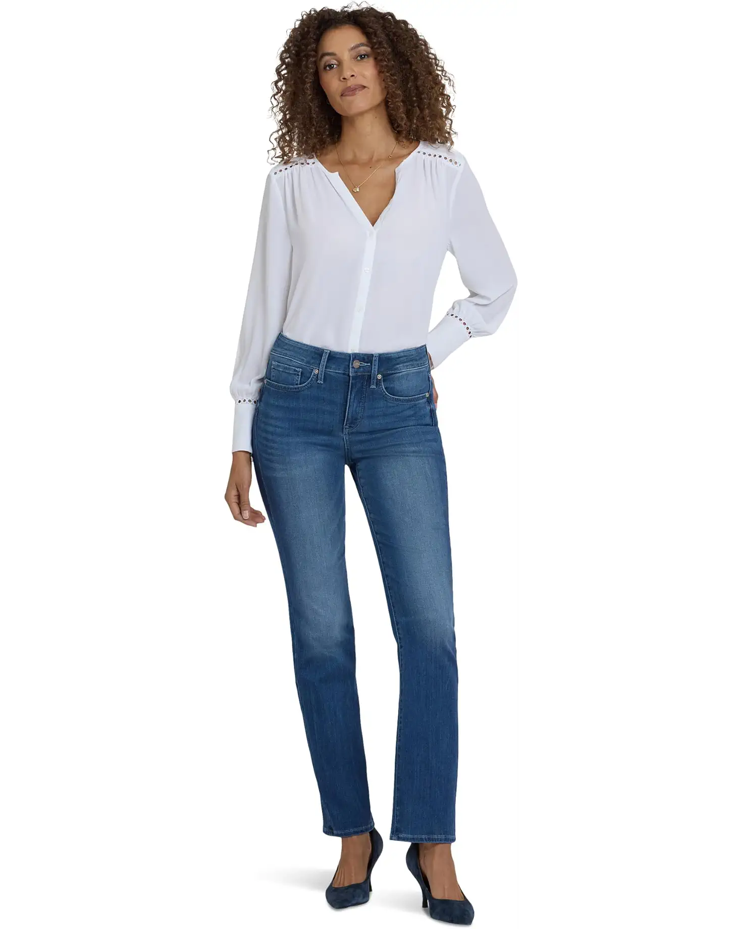 - You can't go wrong with the iconic fit and style of the NYDJ® Marilyn Jeans. The curve-sculpting, figure-elongating construction of NYDJ's Marilyn Straight Jeans pairs well with everything, in a classic straight-leg silhouette. It features a zip-fly & button closure, lift tuck technology®, belt loops, and classic five-pocket styling. Sure Stretch® Denim features an unbelievably comfortable, advanced denim blend with maximum stretch.