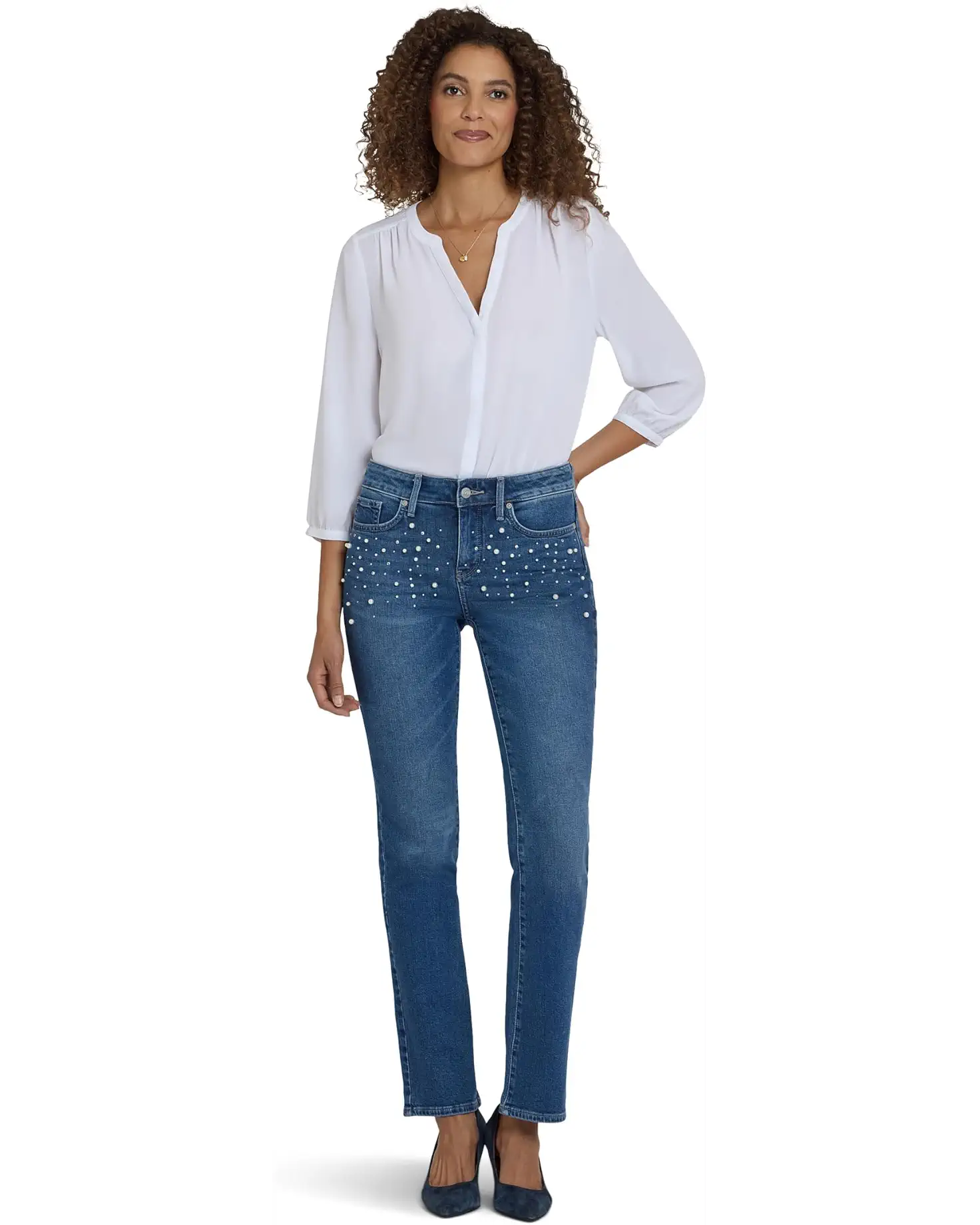 • Your casual jeans just got a stylish update with the NYDJ® Petite Marilyn Straight Jeans in Lake Notre-Dame. The curve-sculpting, figure-elongating construction of this jeans pairs well with everything, in a versatile straight-leg silhouette. This straight-leg style features a high-rise waist with belt loops, a zip-fly & button closure, a five-pocket design, and faux pearl & rhinestone embellishment on the front hips for a touch of glam. It is made with Lift Tuck Technology® to flatten in the front and flatter curves in the back.