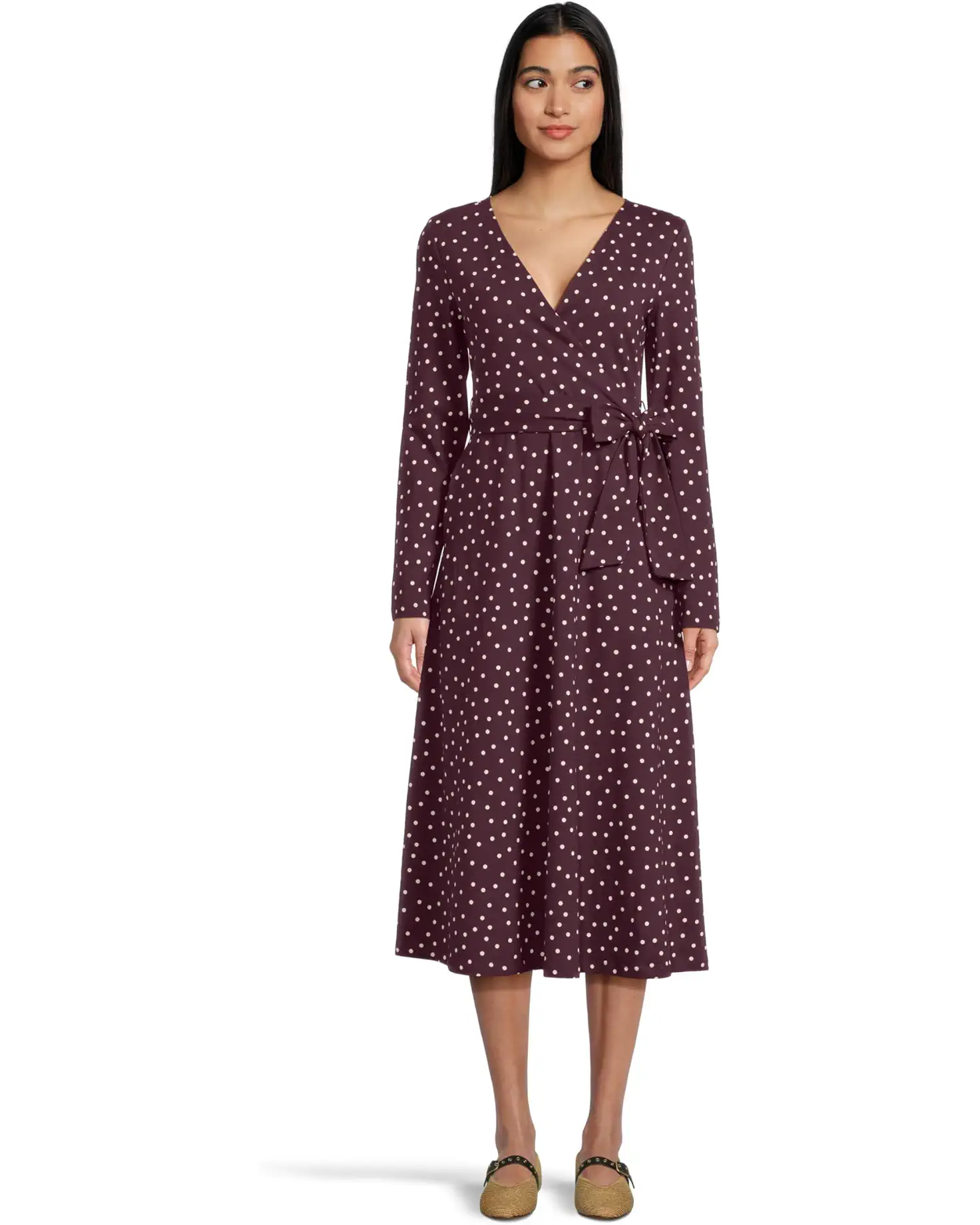 - The silhouette you know and love, in a clean, organic fabric that feels as good as it looks. Thoughtfully designed with you in mind, the PACT® Fit & Flare Faux Wrap Dress is an instant classic for your collection, with a flattering silhouette that can be dressed up or down. Made with the brand's signature jersey knit that shapes, drapes, and molds to your figure - while still feeling soft and comfortable, this midi dress features an allover polka dot print. It is styled with long sleeves, a V-neckline, and an elasticized waistband with a removable fabric belt.