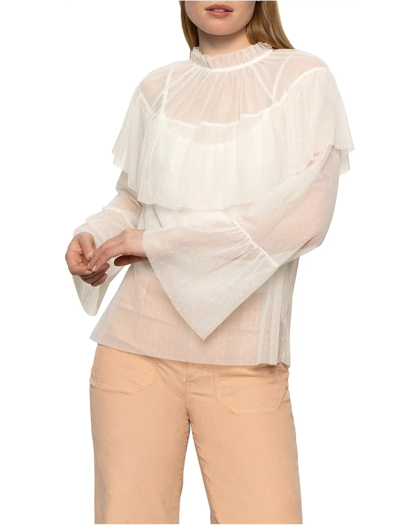 • Stay on-trend with Sanctuary™ The Ethereal Blouse featuring long billowy sleeves, a relaxed fit, and a ruffled mock neckline. It has a self-tie closure at the back for added charm. Its lightweight fabrication offers breathable comfort throughout.