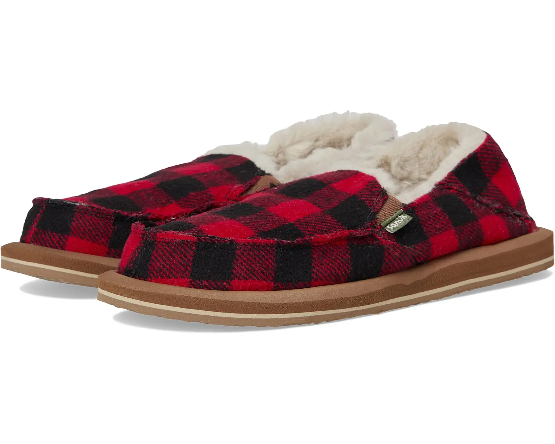 - Walk your way with confidence and style wearing the Sanuk® Donna Buffalo Chill Loafers. The slip-on style loafers are crafted with a classic buffalo plaid polyester upper with traditional raised toe seam, elastic gore detail, and a kickdown heel for easy entry. Contoured high rebound Soft Top footbed is treaded to prevent the growth of microorganisms for barefoot-friendly wear. Happy U tread sponge rubber outsole comes with recycled materials.