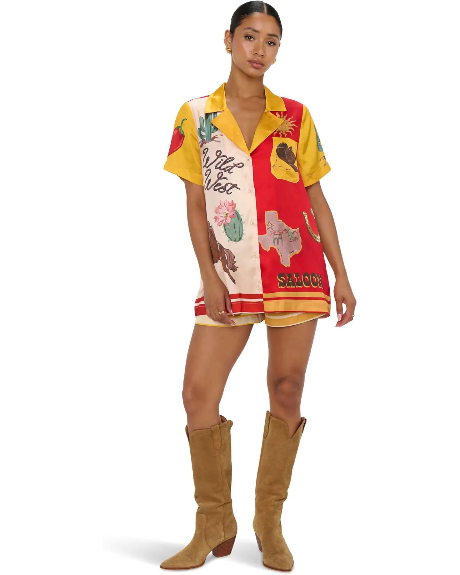 - Saddle up in style, this Show Me Your Mumu™ Home And Away Pajama Set is serving wild west realness with Texas-sized flair! Crafted with a playful rodeo-inspired print, this pajama set brings all the fun of desert sunsets and cactus kisses right into your lounge look. Featuring a chic notch lapel collar, breezy short sleeves, and a button-front closure, the top blends laid-back vibes with polished details, while the chest pocket adds a touch of casual charm. The matching shorts feature a comfy elasticized waistband and pull-on design for an effortlessly relaxed fit.