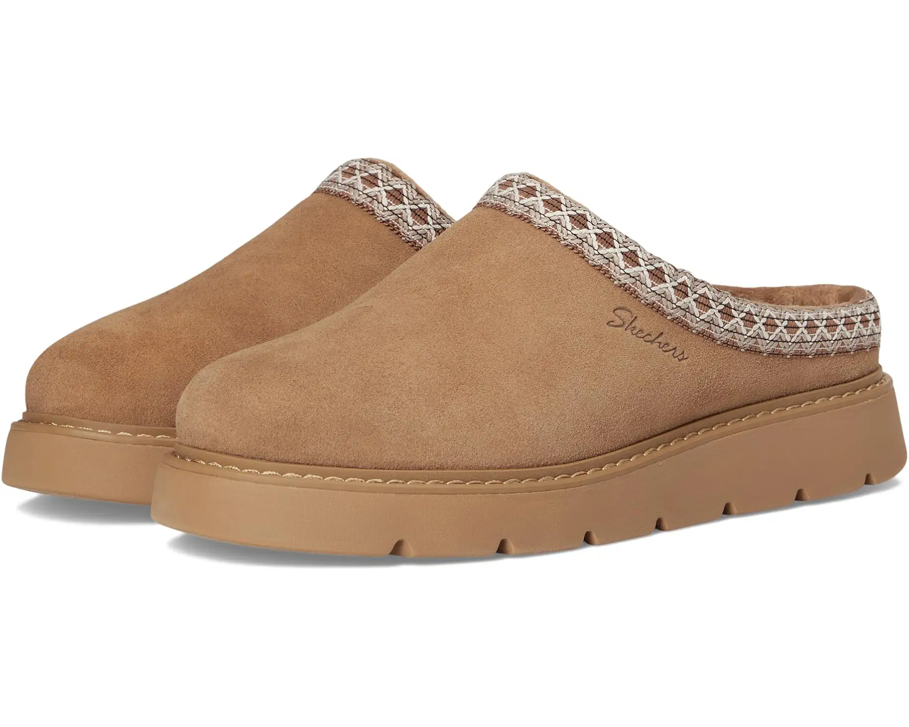 • Elevate your steps in cozy comfort wearing SKECHERS® Cozy Up - Cozy Cascade slippers. These clog-style slippers feature a suede upper with a webbed collar and a plush wool lining, plus a cushioned Skechers Memory Foam™ footbed. The shock-absorbing, low-profile midsole of these clogs provides cushioned comfort. Easy to slip on and off, these clog slippers keep your feet comfortable and cozy.
