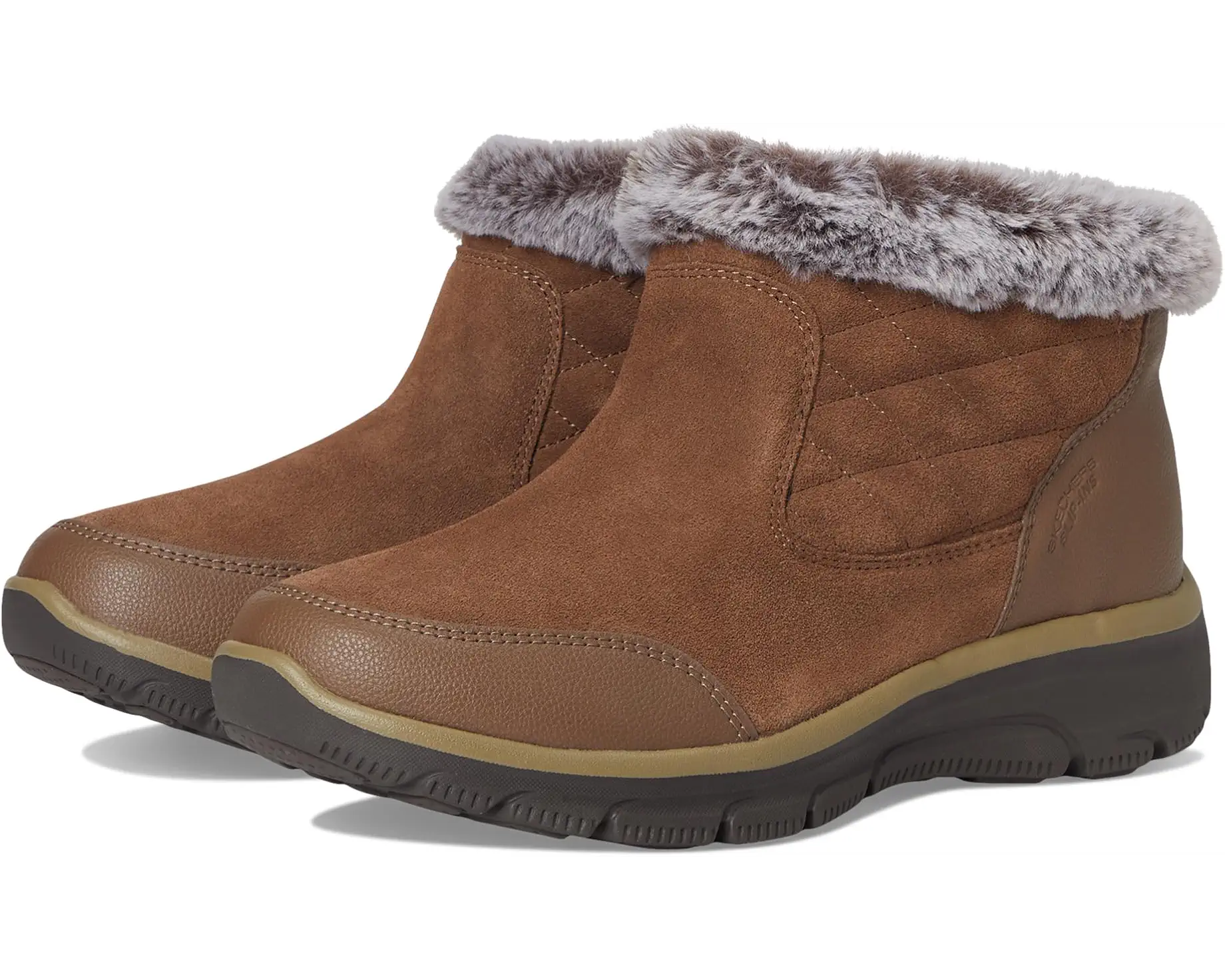 - Step into the season with effortless comfort wearing SKECHERS® Easy Going - Small Towns Hands Free Slip-ins. Designed with our exclusive Heel Pillow™, this cozy ankle bootie features a 3M® Scotchgard® treated suede and duraleather upper with a quilted shaft, faux-fur collar and lining, plus a Skechers® Air-Cooled Memory Foam® insole.