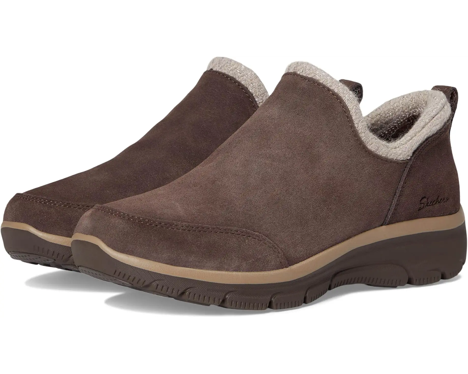 - Get warm comfort and smart, versatile style instantly choosing the SKECHERS® Easy Going - Sweet Behavior. Soft suede upper in a low ankle-height slip-on casual cool weather bootie with chenille collar trim and Skechers Air-Cooled Memory Foam® cushioned comfort insole. It has a bootie design with cutaway sides for flexible, easy-wearing comfort.